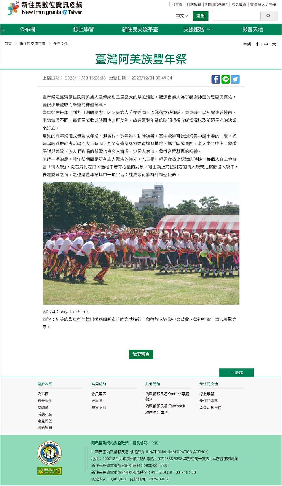 | 1 | ![]() | 網站名稱 新住民數位資訊e網 網址 https://nit.immigration.gov.tw/Multicultural/Detail/c781662b-8cd1-4e53-ad13-0716e5e6143f 網站簡介 臺灣阿美族豐年祭 | 王素美 | 2025/10/3 上午 02:37:55 |