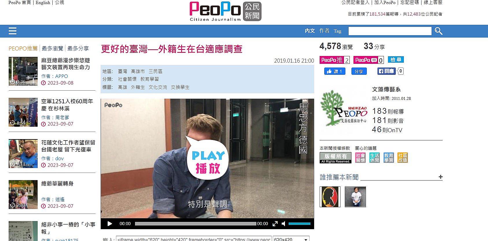 | 1 | ![]() | 網站名稱 PEOPO公民新聞 網址 https://www.peopo.org/news/392191 網站簡介 更好的臺灣—外籍生在台適應調查 近年來越來越多外國人到台灣讀書,我們在這邊採訪了幾位外國朋友,想了解他們為什麼會選擇來台灣,以及因為文化的不同,在生活上是否造成他們生活上的不方便。 | 林宇貞 | 2023/9/9 下午 12:13:34 |