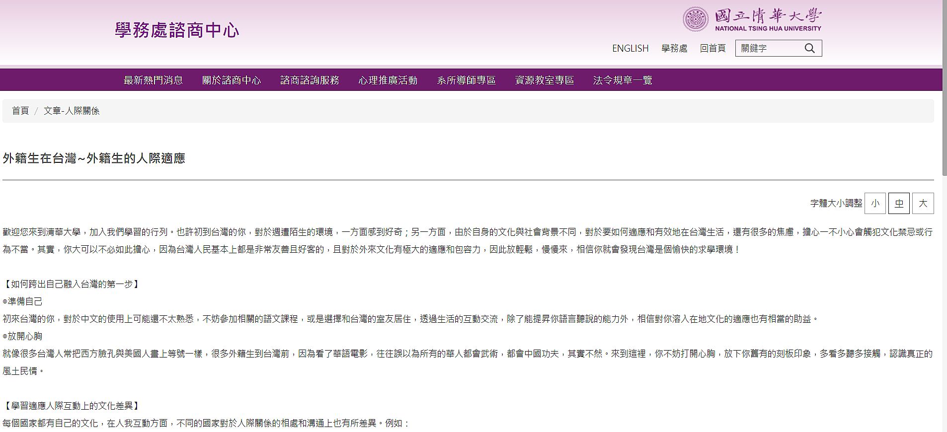 | 3 | ![]() | 網站名稱 清華大學校網 網址 https://counsel.site.nthu.edu.tw/p/406-1250-218162,r9413.php 網站簡介 給清華大學外籍生在台灣~外籍生的人際適應的建議。 | 林宇貞 | 2023/9/9 下午 12:21:26 |
