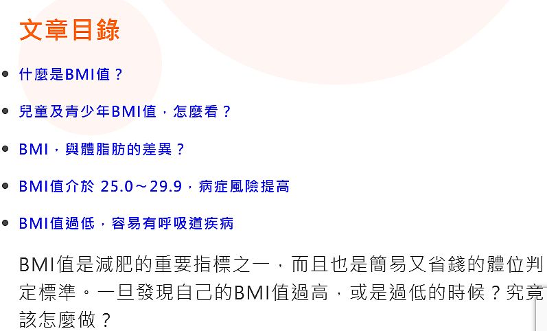 | 1 | ![]() | 網站名稱 BMI值不足以當成健康指標!一旦超過這數值,將提高罹患乳癌、大腸癌與子宮內膜癌機 網址 https://www.mombaby.com.tw/articles/9929920 網站簡介 對照兒童或青少年之年齡和性別並計算BMI值,就可以判斷兒童及青少年的體重是否標準!當BMI超過至於還處於生兒童及青少年,不但身高會增長,體重也會變動,所以需要參考衛生福利部公布之「兒童及青少年生長身體質量指數(BMI)建議值」,該體位標準是以該年齡層BMI的百分位,作為肥胖的切點該年齡層的95百分位時,就是肥胖。 根據WHO的定義,標準的成人BMI值,應介於 18.5〜24.9 之間,如果BMI值介於 25.0〜29.9,共病症的風險會增加。 | 郭彥勳 | 2025/6/4 下午 03:16:07 |