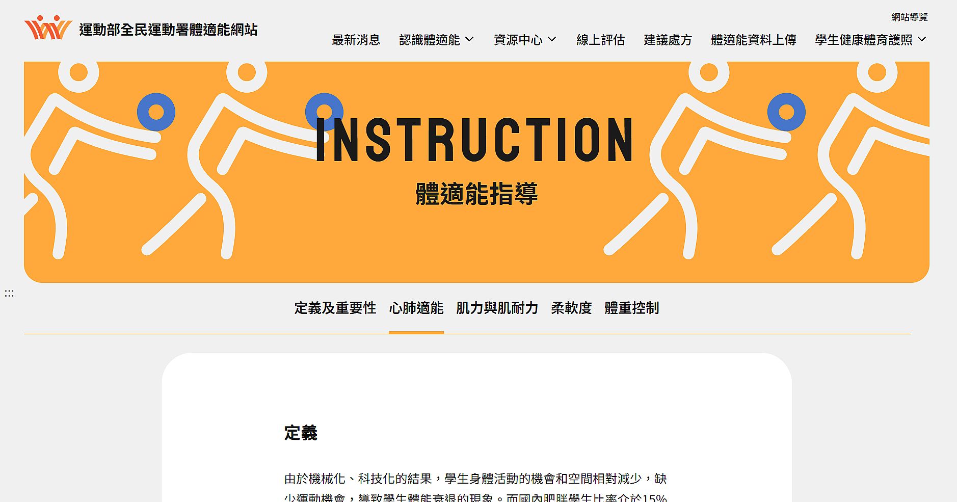 | 2 | ![]() | 網站名稱 心肺適能的定義及運動處方 網址 https://www.fitness.org.tw/fitness-instruction#cardiorespiratory-tab-pane 網站簡介 心肺適能,也可以稱為心肺耐力,是指個人的肺臟與心臟,從空氣中攜帶氧氣,並將氧氣輸送到組織細胞加以使用的能力。因此心肺適能可以說是個人的心臟、肺臟、血管與組織細胞有氧能力的指標。提升心肺適能的重要性心肺適能較佳,可以使我們運動持續較久、且不至於很快疲倦,也可以使我們平日工作時間更久,更有效率。 以健康的角度來看,擁有良好的心肺適能可以避免各種心血管疾病,因此心肺適能可說是健康體能的重要因素,也是體適能運動的重點。 運動處方的五個要領: 一 運動方式 、二 運動頻率、三 運動強度 、四 運動持續時間、五 漸進原則 | 邱姵穎 | 2025/9/22 下午 05:03:45 |