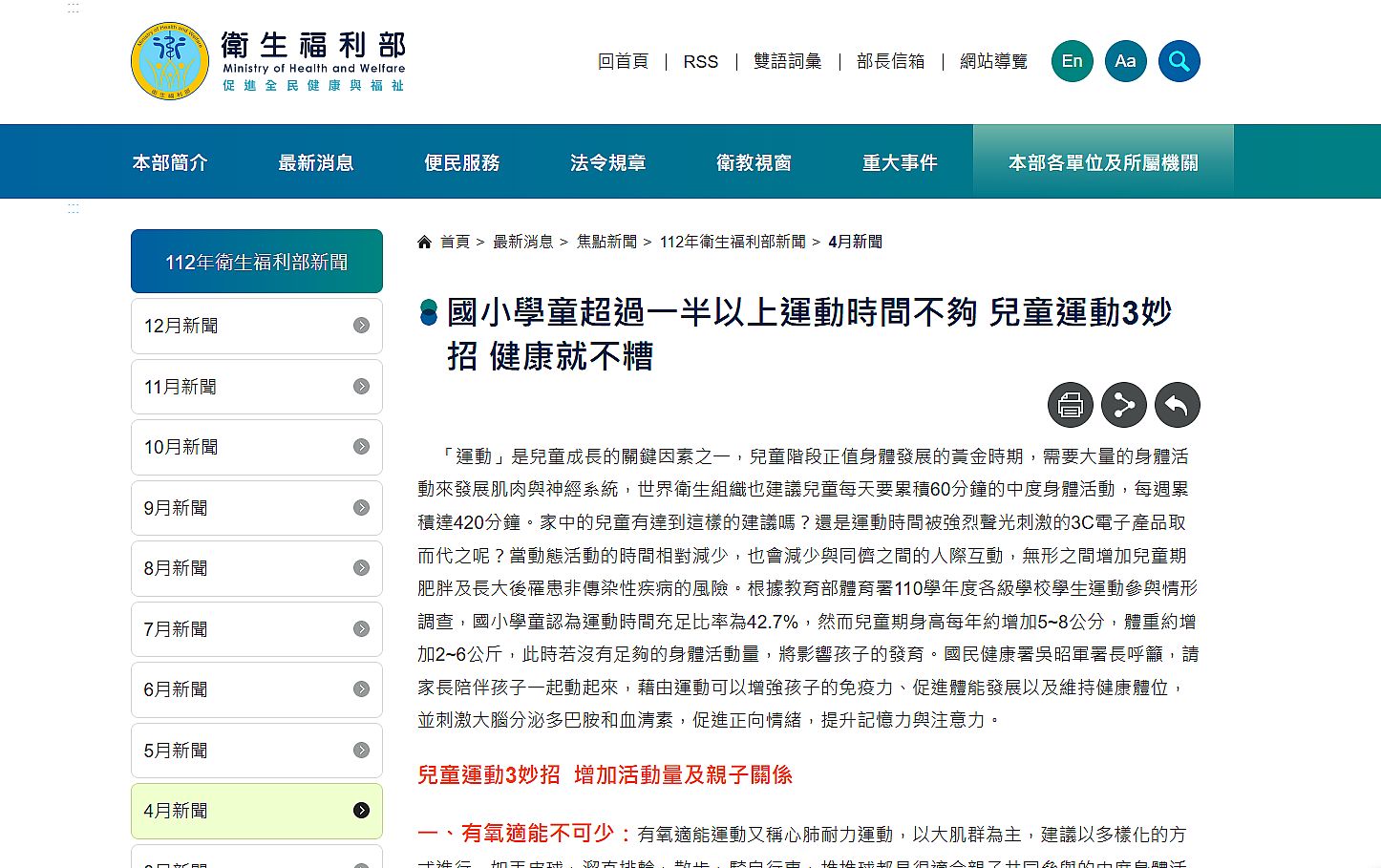 | 3 | ![]() | 網站名稱 衛生福利部新聞-國小學童超過一半以上運動時間不夠 兒童運動3妙招 健康就不糟 網址 https://www.mohw.gov.tw/cp-6565-74357-1.html 網站簡介 「運動」是兒童成長的關鍵因素之一,兒童階段正值身體發展的黃金時期,需要大量的身體活動來發展肌肉與神經系統,世界衛生組織也建議兒童每天要累積60分鐘的中度身體活動,每週累積達420分鐘。家中的兒童有達到這樣的建議嗎?還是運動時間被強烈聲光刺激的3C電子產品取而代之呢?當動態活動的時間相對減少,也會減少與同儕之間的人際互動,無形之間增加兒童期肥胖及長大後罹患非傳染性疾病的風險。 兒童運動三妙招 增加活動量及親子關係 一、有氧適能不可少、二、強度增加慢慢來、三、強化骨骼長得高 | 邱姵穎 | 2025/9/24 下午 03:10:30 |
