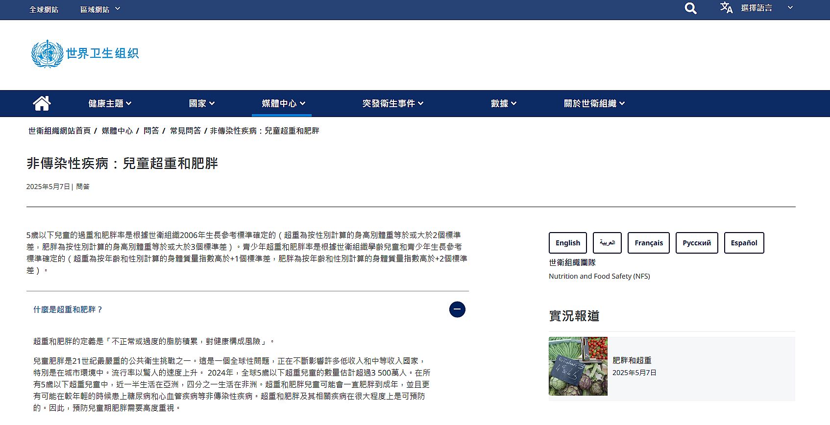 | 4 | ![]() | 網站名稱 世界衛生組織-非傳染性疾病:兒童超重和肥胖 網址 https://www.who.int/zh/news-room/questions-and-answers/item/noncommunicable-diseases-childhood-overweight-and-obesity 網站簡介 5歲以下兒童的過重和肥胖率是根據世衛組織2006年生長參考標準確定的(超重為按性別計算的身高別體重等於或大於2個標準差,肥胖為按性別計算的身高別體重等於或大於3個標準差)。青少年超重和肥胖率是根據世衛組織學齡兒童和青少年生長參考標準確定的(超重為按年齡和性別計算的身體質量指數高於+1個標準差,肥胖為按年齡和性別計算的身體質量指數高於+2個標準差)。 超重和肥胖的定義是「不正常或過度的脂肪積累,對健康構成風險」。 | 邱姵穎 | 2025/9/24 下午 03:26:37 |