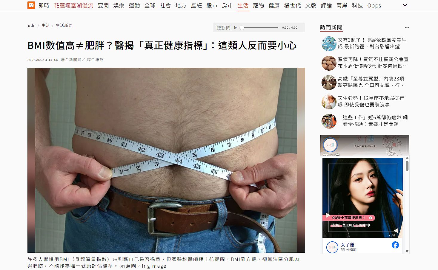 | 5 | ![]() | 網站名稱 聯合新聞網-BMI數值高≠肥胖?醫揭「真正健康指標」:這類人反而要小心 網址 https://udn.com/news/story/7266/8936581 網站簡介 許多人習慣用BMI(身體質量指數)來判斷自己是否過重,但家醫科醫師魏士航提醒,BMI雖方便,卻無法區分肌肉與脂肪,不能作為唯一健康評估標準。他指出,腰圍、體脂率與體能表現,才更能反映真實的健康狀況。 魏士航在臉書表示,BMI是用體重除以身高平方計算,依衛福部國民健康署定義,18.5~24屬健康體重,24~27為過重,27~30為輕度肥胖。然而,他曾遇過肌肉量充足的國軍弟兄,雖然BMI超過標準,實際上體能一流、身體狀況良好;反之,有些人BMI正常,但體脂率高、肌肉量低,健康風險反而更大。 除了BMI,還有三項指標更能反映健康狀況: 1. 腰圍與腰臀比、2. 體脂率、3. 體能表現 | 邱姵穎 | 2025/9/24 下午 03:28:35 |