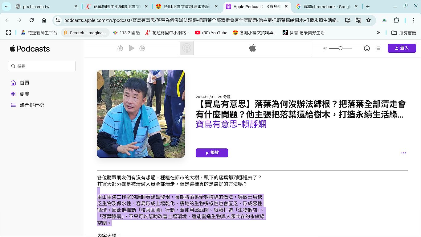 | 1 | ![]() | 網站名稱 【寶島有意思】落葉為何沒辦法歸根?把落葉全部清走會有什麼問題?他主張把落葉還給樹木,打造永續生活綠空間│主持人賴靜嫻 ft.台灣里山里海推廣協會講師黃建雄 網址 https://podcasts.apple.com/tw/podcast/%E5%AF%B6%E5%B3%B6%E6%9C%89%E6%84%8F%E6%80%9D-%E8%90%BD%E8%91%89%E7%82%BA%E4%BD%95%E6%B2%92%E8%BE%A6%E6%B3%95%E6%AD%B8%E6%A0%B9-%E6%8A%8A%E8%90%BD%E8%91%89%E5%85%A8%E9%83%A8%E6%B8%85%E8%B5%B0%E6%9C%83%E6%9C%89%E4 網站簡介 里山里海工作室的講師黃建雄發現,長期將落葉全數掃除的做法,導致土壤缺乏生物及保水性,容易形成土壤乾化,棲地的生物多樣性也會匱乏,形成惡性循環。因此他推動「枝葉園圃」行動,並使用鐵絲圈、紙箱打造「生物飯店」、「落葉膠囊」,不只可以幫助改善土壤環境,還能營造生物與人類共存的永續綠空間。 | 莊鄧巧恩 | 2025/9/2 下午 02:04:16 |