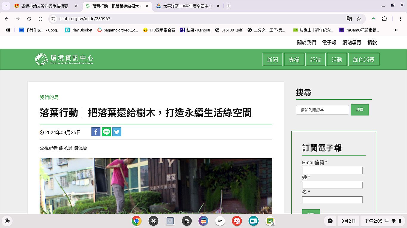 | 2 | ![]() | 網站名稱 落葉行動|把落葉還給樹木,打造永續生活綠空間 網址 http://ourisland.pts.org.tw/ 網站簡介 雖然落葉會散發臭味,但是可以做落葉膠囊來裝它,這樣做不但減少了草地上的落葉,也讓昆蟲有東西吃,一個落葉膠囊就可以讓牠們吃好幾個月,這樣做還可以美化小區,一個小小的舉動,就能有這麼多的好處,真是令人驚訝! | 楊千荷 | 2025/9/2 下午 02:07:17 |