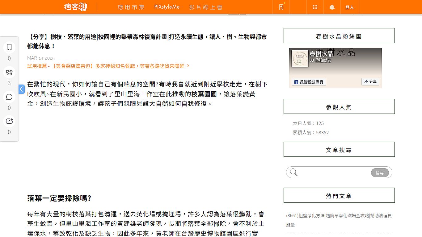| 3 | ![]() | 網站名稱 【分享】樹枝、落葉的用途|校園裡的熱帶森林復育計畫|打造永續生態,讓人、樹、生物與都市都能休息! 網址 https://magician0104.pixnet.net/blog/post/178450993 網站簡介 落葉如果一直在地上會讓人看著心煩,但是裝桶又太麻煩,所以大家決定製作落葉膠囊,來裝落葉,這樣不但環保,還可以施肥。 | 楊千荷 | 2025/9/2 下午 02:49:38 |