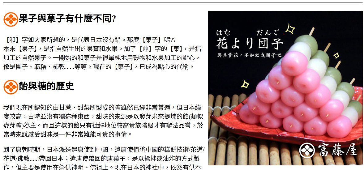 | 2 | ![]() | 網站名稱 富藤屋~紫陽花的和菓子鋪 網址 https://www.fotenhouse.url.tw/mobile/whatiswagasi-mobile.htm 網站簡介 我們現在所認知的由甘蔗、甜菜所製成的糖雖然已經非常普遍,但日本緯度較高,古時並沒有糖這種東西,甜味的來源是以發芽米來提煉的飴(類似麥芽糖)為主。而且這樣的飴只有社經地位較高貴族階級才有辦法品嘗,於當時來說感受甜味是一件非常難能可貴的事情。 戰國時代最後由德川家康打敗了豐臣秀吉一統天下,開創了江戶時代,經濟發展的中心也從京都,遷到了現在的東京(江戶)。和平的時代到來,人民更有經濟能力且更希望品嘗甜點。隨著茶聖 千利休 發展的茶道興盛,和茶道相依相存的和菓子也蓬勃了起來。和菓子發源地京都為主的【京菓子】和江戶為主的【上菓子】戶別苗頭。並在各當地發展了不同特色。 經歷許多歷史變革的和菓子,伴著日本人的堅持的性格,發展出一套精緻內斂的學問。注重季節、外觀,包入詩歌與俳句,讓高級的和菓子帶著藝術品的價值。 在幕府解散,明治維新之後,西洋文化排山倒海的進入日本。機械技術讓菓子的製程更為便利,所以高級、如同藝術品般和菓子也已經不限於王公貴族品嘗。樸實、在地化、具生命力的菓子,到現在也是日本各處當的特色美食。 | 呂侑耘 | 2025/7/18 下午 08:32:35 |
