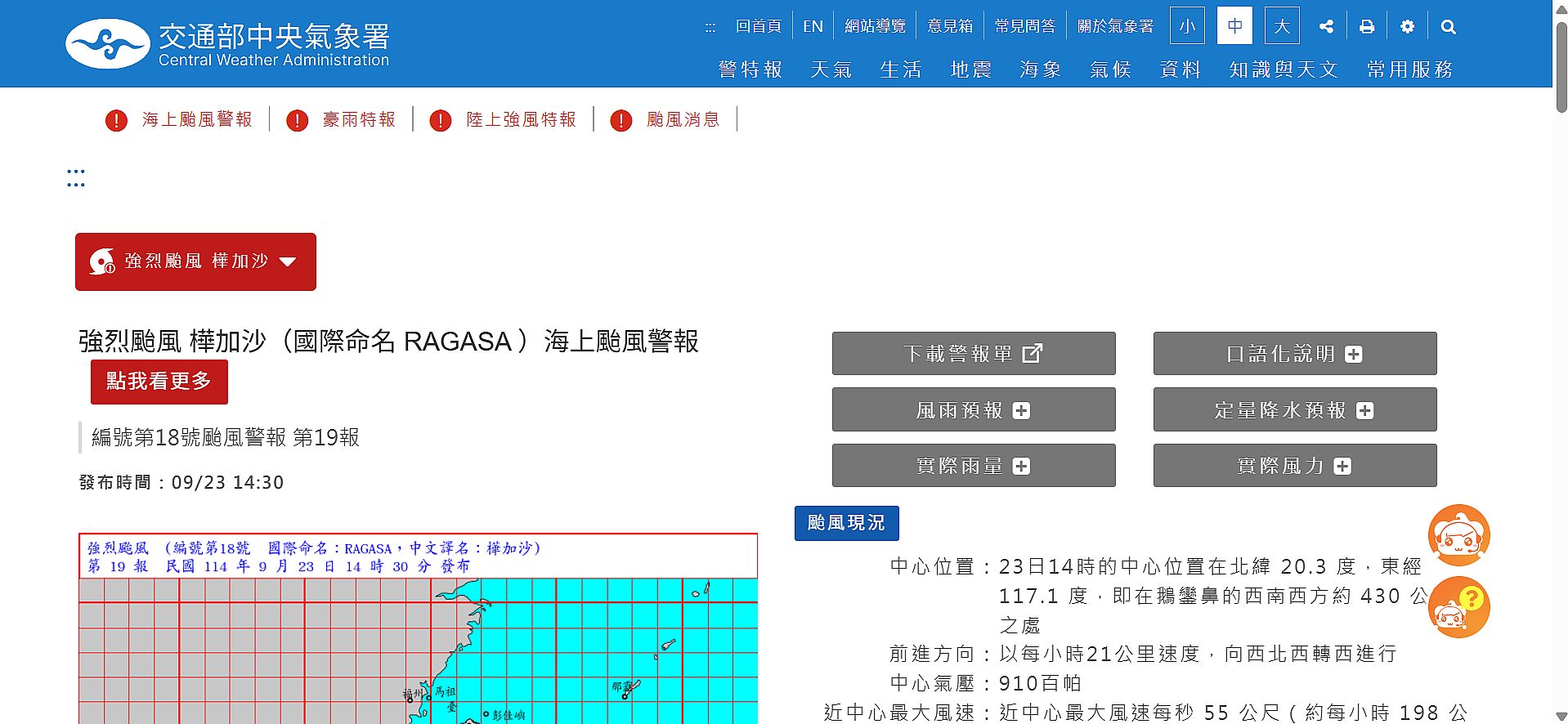 | 5 | ![]() | 網站名稱 交通部中央氣象署 網址 https://www.cwa.gov.tw/V8/C/ 網站簡介 交通部中央氣象署是我國專責氣象業務的核心機關,前身為中央氣象局,於2023年正式改制成立。其官方網站提供全面且即時的氣象資訊,內容涵蓋各地區天氣預報、逐時溫度、降雨雷達回波、空氣品質、海象資訊、地震速報及颱風路徑等,方便民眾快速掌握天氣與災害動態。網站也設置災害警特報專區,包含颱風、豪雨、大雨、強風及低溫等警示資訊,協助政府及民眾提早做好因應措施,減少災害損失。除此之外,網站提供教育與科普資源,像是天氣小百科、互動教具及教學文章,增進社會大眾對氣象知識與地球科學的理解。網站同時也開放專業數據服務,讓研究人員或產業單位能應用於分析與決策。整體而言,中央氣象署網站不僅是日常生活中查詢天氣的重要平台,更是防災、教育與研究的關鍵資訊來源,致力於守護民眾安全與提升社會防災韌性。 | 謝忻桐 | 2025/9/23 下午 03:10:29 |