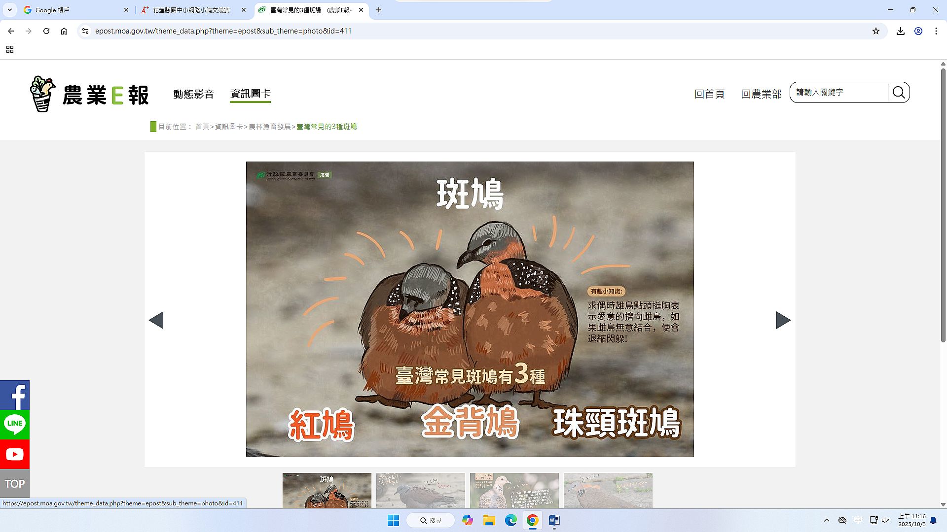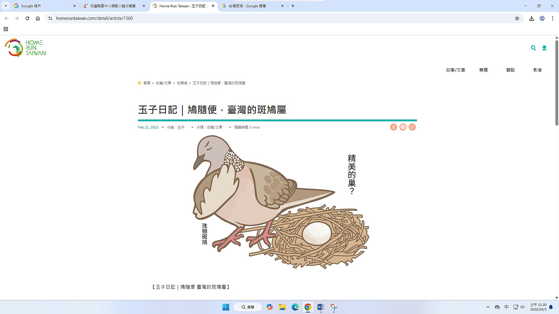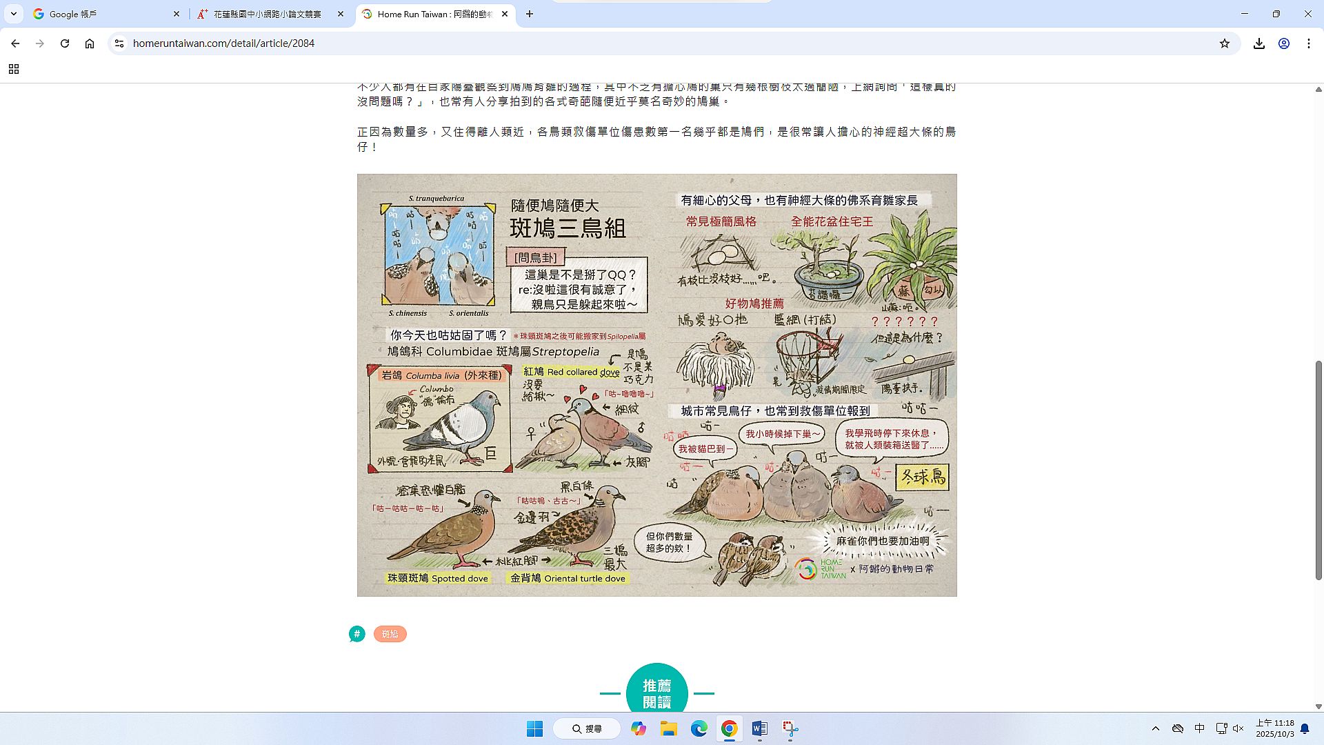 | 2 | ![]() | 網站名稱 台灣常見的斑鳩 網址 https://homeruntaiwan.com/detail/article/2084 網站簡介 這個網站在說台灣三種斑鳩的介紹分別是珠頸斑鳩.紅鳩跟金背鳩的習性 | 昌芫西 | 2025/10/3 上午 11:19:20 |