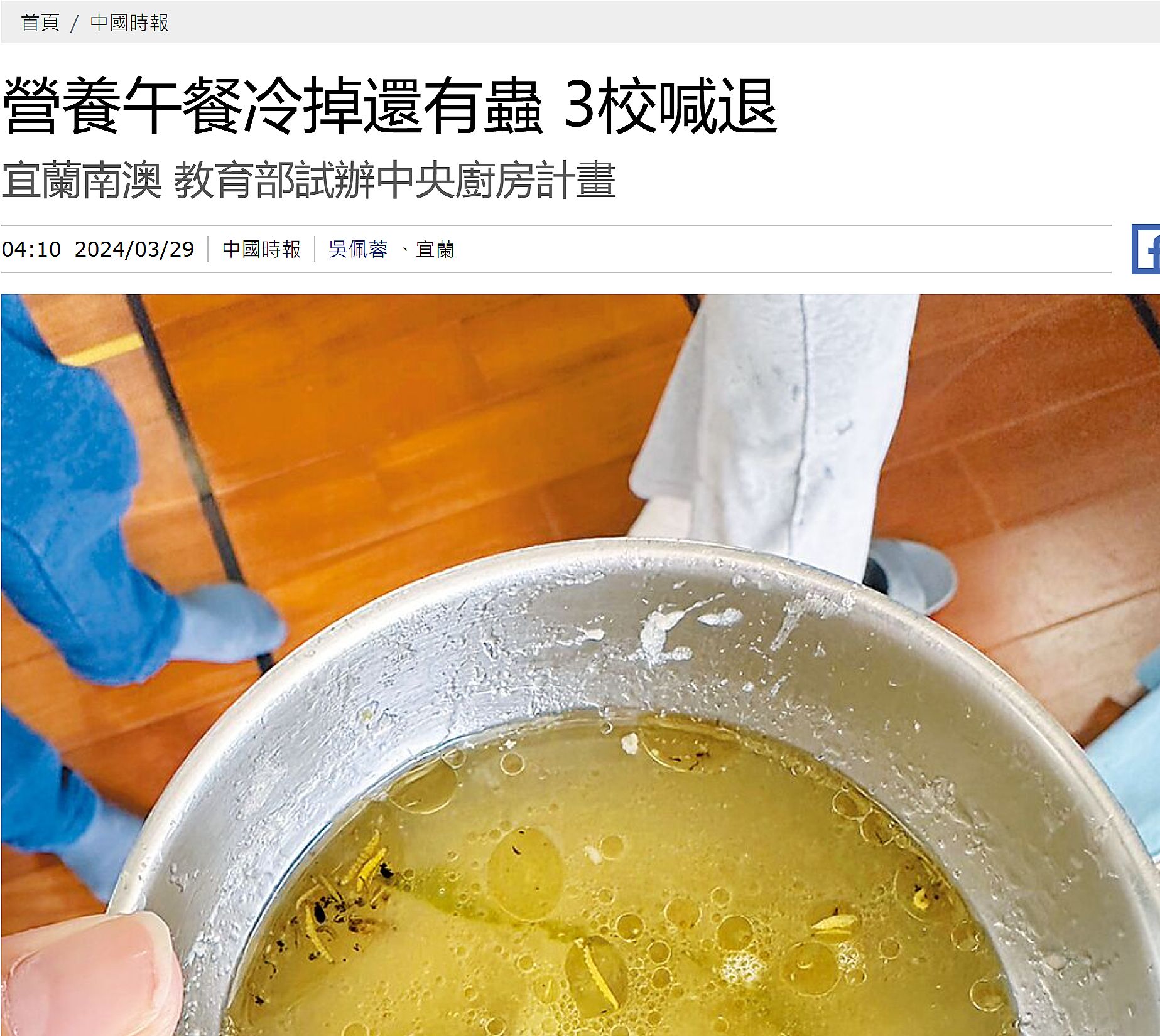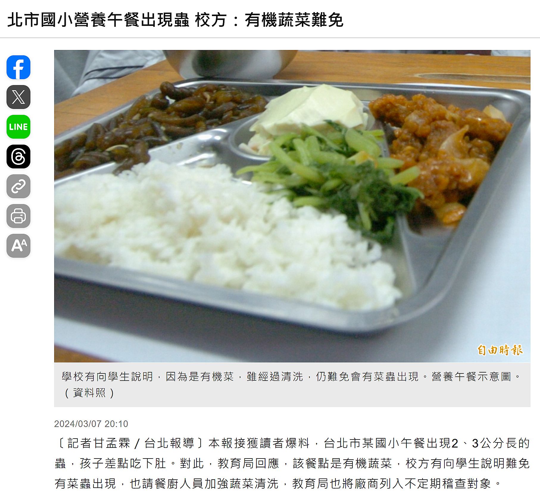 | 2 | ![]() | 網站名稱 自由時報 網址 https://news.ltn.com.tw/news/life/breakingnews/4600711 網站簡介 台北市某國小午餐出現2、3公分長的蟲,孩子差點吃下肚。對此,教育局回應,該餐點是有機蔬菜,校方有向學生說明難免有菜蟲出現,也請餐廚人員加強蔬菜清洗,教育局也將廠商列入不定期稽查對象。 爆料者郭先生指出,就讀五年級的兒子3月5日跟他反映,學校有同學看到午餐出現菜蟲,是長度約2、3公分的黃色蟲子,而學校廚房近日抽風馬達毀損,近期的餐點都由團膳業者總廠供餐。 | 葉瑾瑜 | 2025/6/7 下午 08:16:19 |