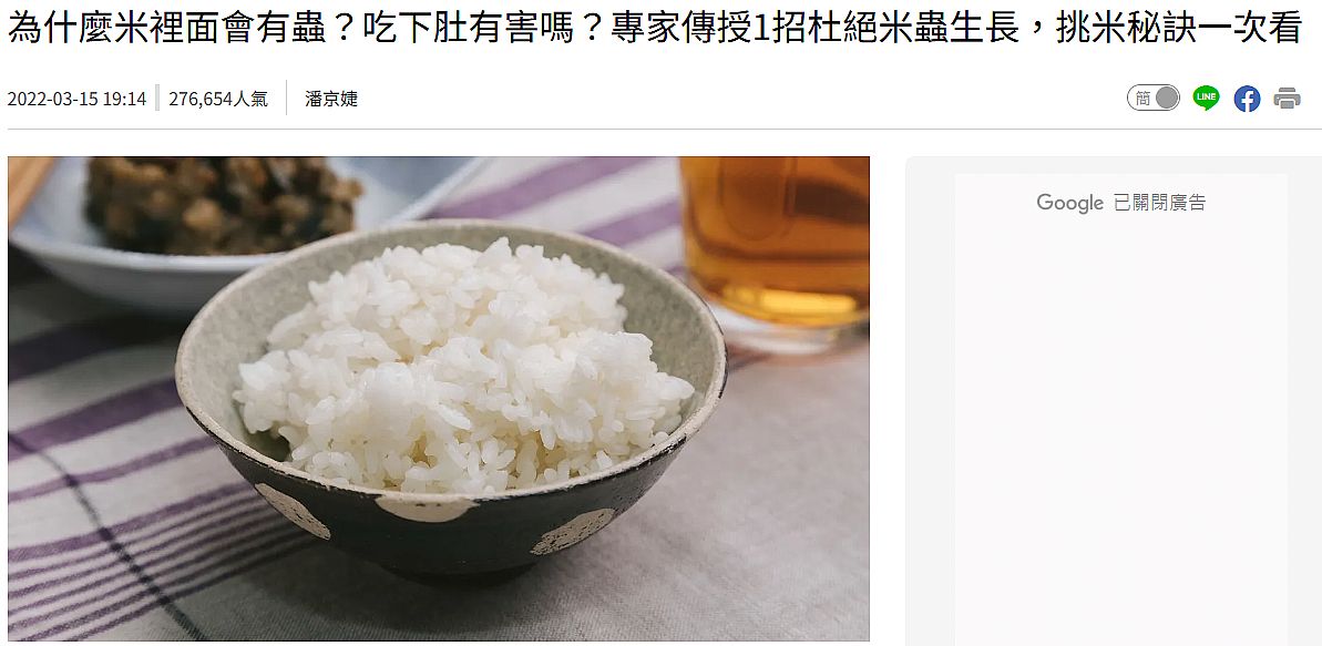 | 4 | ![]() | 網站名稱 風傳媒 網址 https://www.storm.mg/lifestyle/4240218 網站簡介 此網站描述農委會說明,台灣有超過上百種的米蟲種類,不過最常見的有4種,分別是米象、穀蠹、麥蛾、外米綴蛾等,各個種類對米的影響也不同。由於穀物是米蟲的主要食物,通常米蟲會趁穀物收割後進到穀倉時進駐。以家中最常見的米象來說,有穎殼保護的稻穀,牠就無法突破穎殼產卵,但碾米後穎殼被除去後,牠就能產卵在米粒中。 農委會表示,其實我們從小到大,誤食米蟲的數量已不可數,因為米象的卵產在米粒中,肉眼無法判別,早在不知不覺中將牠們吃進肚子,「但因米已煮熟,只能把他們想成動物性蛋白了」。不過,農委會也提醒,若1公斤的米生出超過100隻米蟲以上,長黴菌的機會可能會增高很多 農委會建議,想要避免吃到米蟲,只能在挑選時多加留意。購買米時,盡量不一次購買超過2公斤的包裝;買回家後,放入冰箱冷藏即可保3個月不會有米蟲。 農委會指出,雖然冷凍區的確可以凍死米蟲,但米從冷凍區拿出後,容易產生回潮現象,也容易讓米斷裂,導致米煮熟後的口感變差。但若米蟲的數量過多,可先把米放進冷凍區一周後再丟棄,以免米蟲蔓延至其他地方。 另外,農委會提醒,乾燥的義大利麵也是米蟲的食物,因此也要留意,放在低溫保存為佳。 | 葉瑾瑜 | 2025/6/9 下午 03:41:44 |