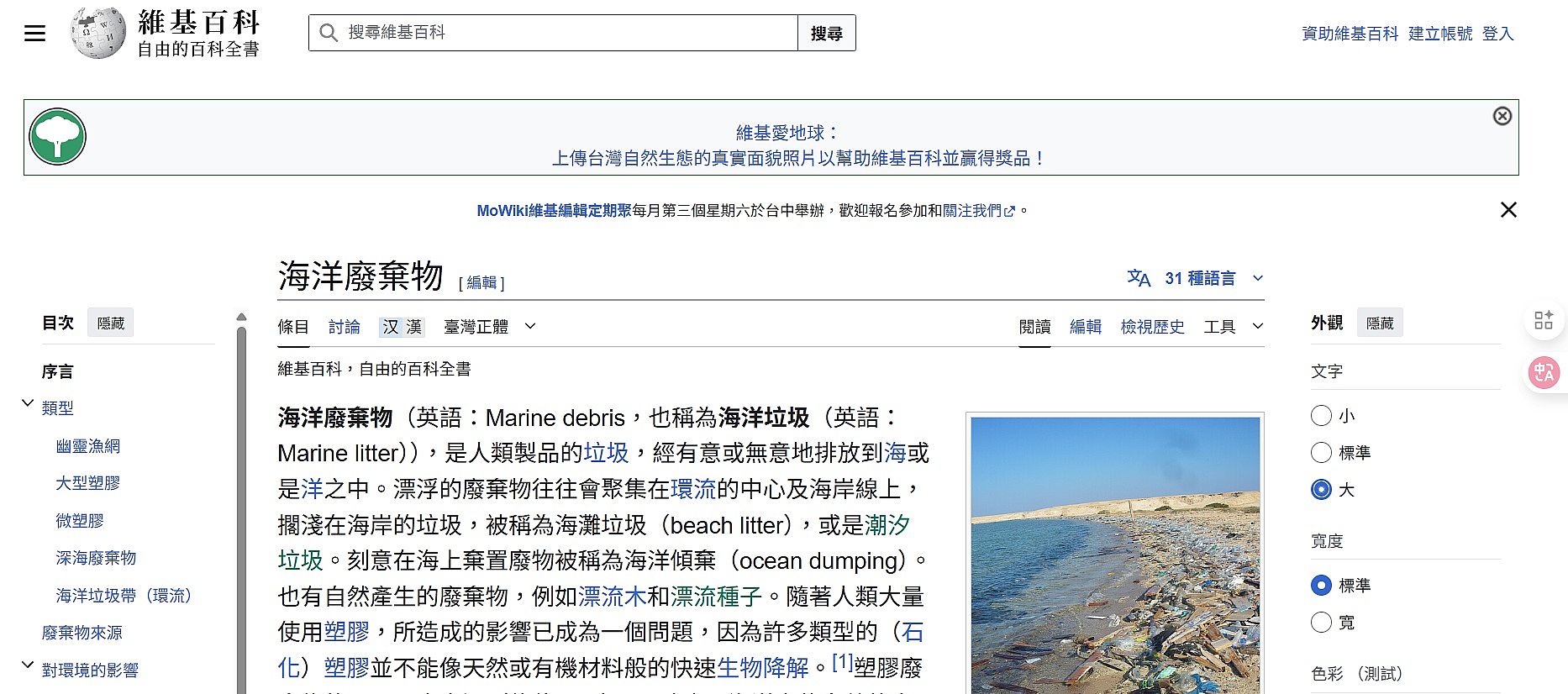 | 1 | ![]() | 網站名稱 維基百科—海洋廢棄物 網址 https://zh.wikipedia.org/wiki/%E6%B5%B7%E6%B4%8B%E5%BB%A2%E6%A3%84%E7%89%A9 網站簡介 定義何為海洋廢棄物(英語:Marine debris,也稱為海洋垃圾(英語:Marine litter)),是人類製品的垃圾,經有意或無意地排放到海或是洋之中。並指出海洋廢棄物對魚類、海鳥、海洋爬行動物和海洋哺乳動物,以及船舶和海岸均構成嚴重威脅。 | 林沛穎 | 2025/6/29 下午 02:31:17 |