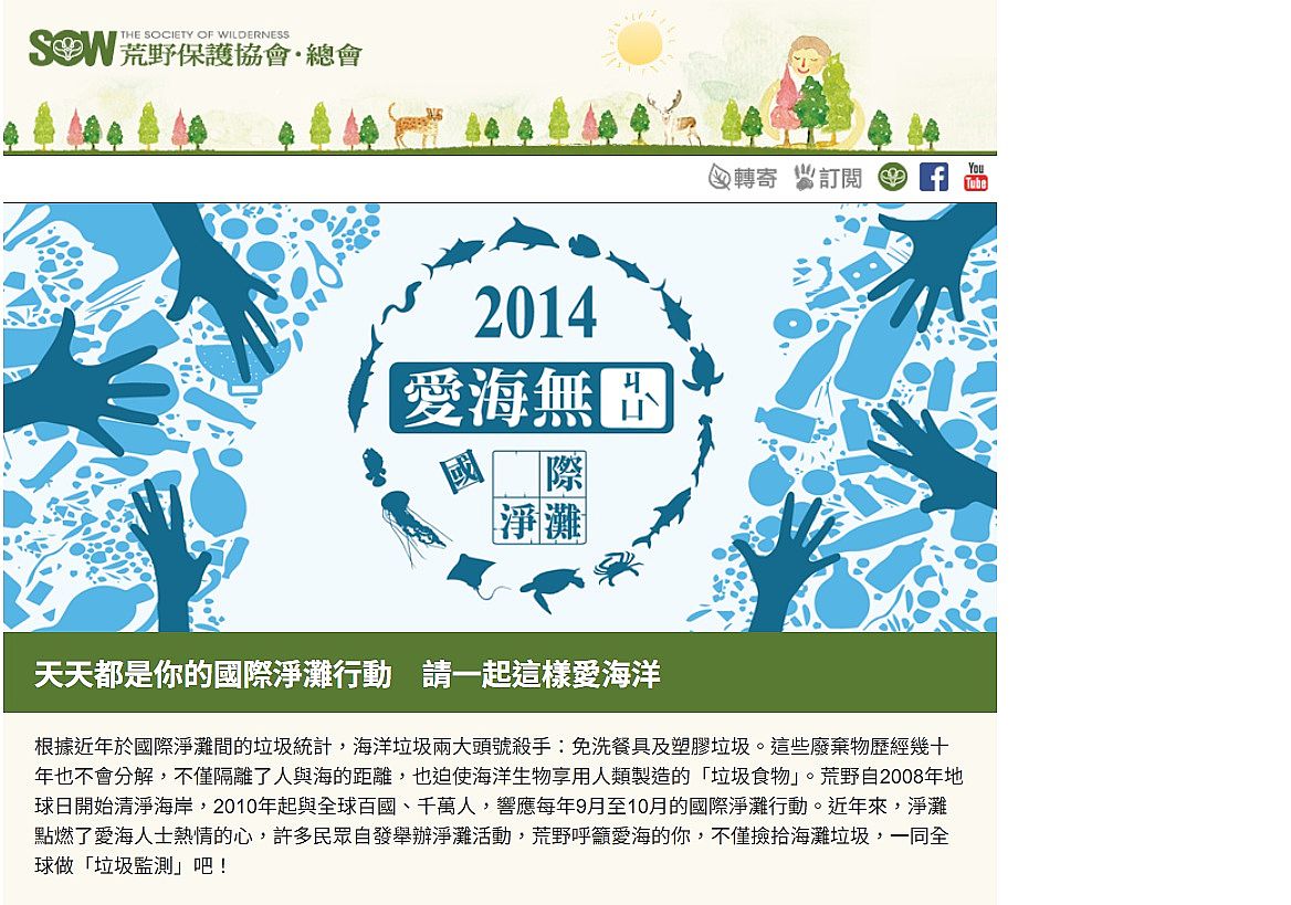 | 2 | ![]() | 網站名稱 荒野保護協會 網址 https://epaper.sow.org.tw/2014/0915/ 網站簡介 海洋垃圾兩大頭號殺手:免洗餐具及塑膠垃圾,它們歷經幾十年也不會分解,迫使海洋生物享用人類製造的「垃圾食物」。 | 林沛穎 | 2025/6/29 下午 02:39:21 |