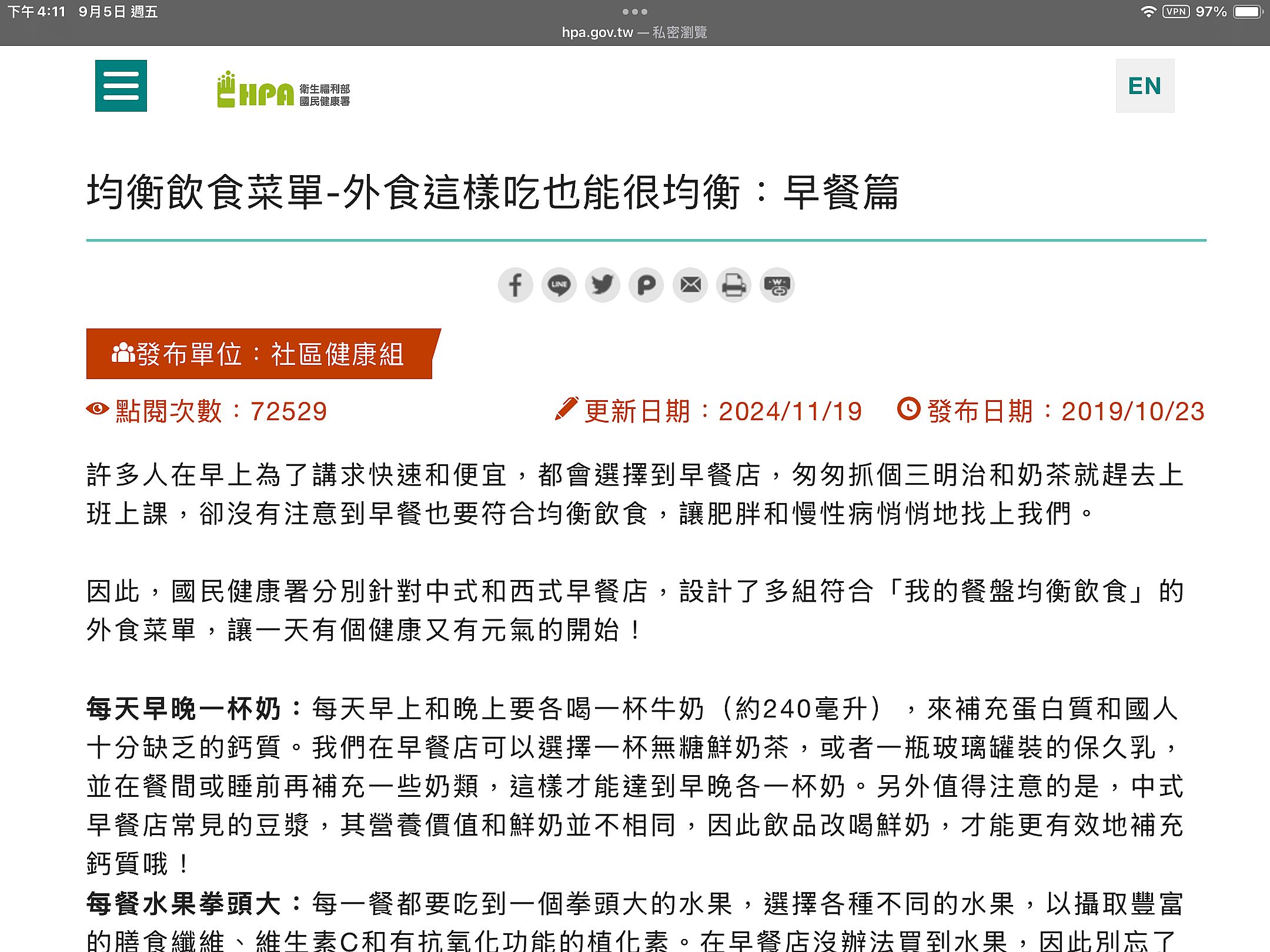 | 1 | ![]() | 網站名稱 均衡飲食菜單-外食這樣吃也能很均衡:早餐篇 網址 https://www.hpa.gov.tw/Pages/Detail.aspx?nodeid=1622&pid=11678&sid=10406 網站簡介 這個網站有五個重點: 1.每天早晚一杯奶,每天早上和晚上要各喝一杯牛奶(約240毫升),來補充蛋白質 2.每餐水果拳頭大,每一餐都要吃到一個拳頭大的水果,選擇各種不同的水果,以攝取豐富的膳食纖維、維生素C和有抗氧化功能的植化素 3.飯跟蔬菜一樣多,每餐主食和蔬菜的份量差不多 4.豆魚蛋肉一掌心,每餐的蛋白質食物,要吃到一個掌心的大小 5.堅果種子一茶匙,每一餐的堅果種子類,約是一茶匙或一個拇指指節的大小。 這一些是國民健康署為了讓大家吃得健康,所以才整理這些早餐的重點給大家看。 | 王淑琳 | 2025/9/5 下午 05:04:52 |