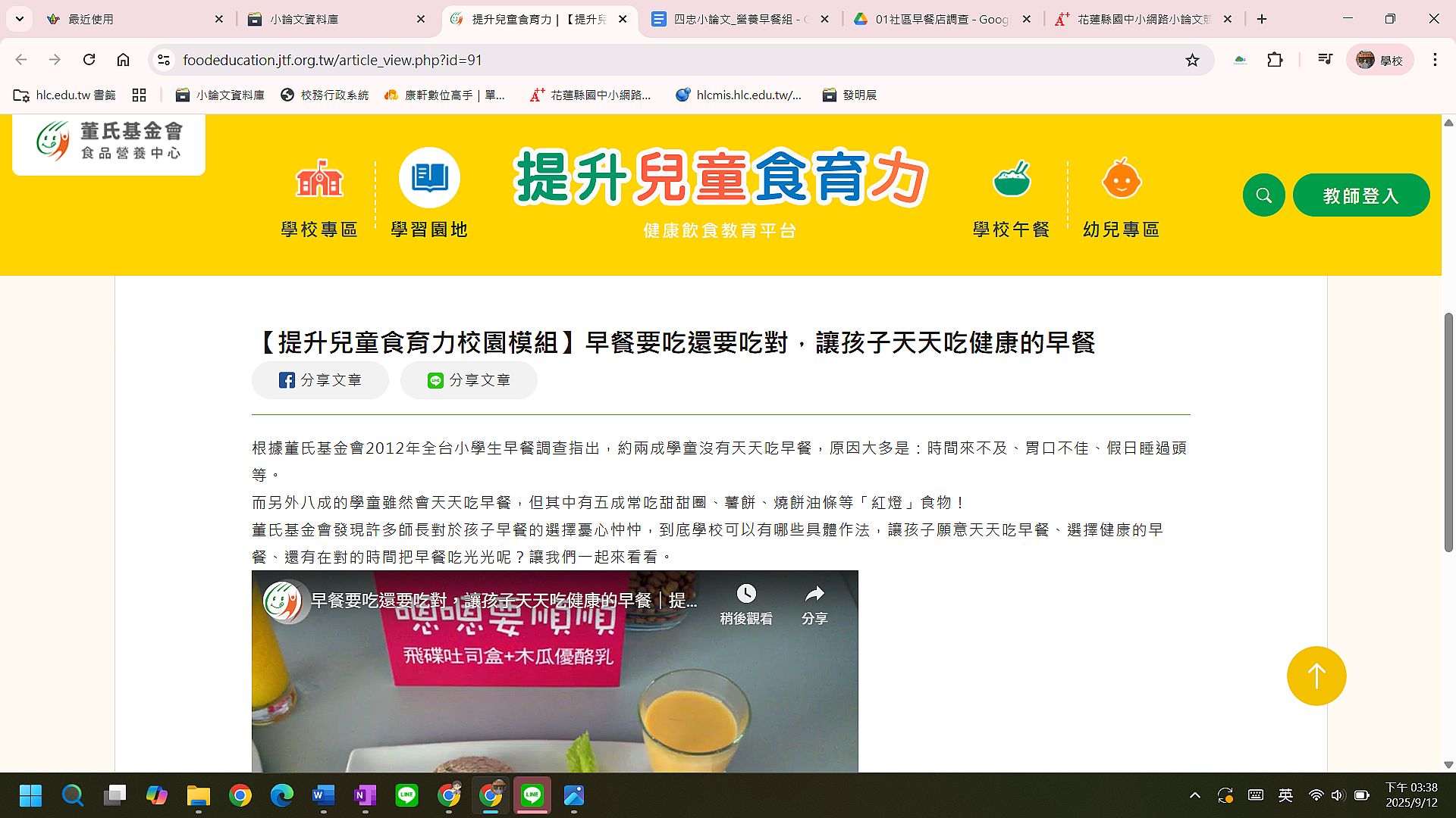 | 2 | ![]() | 網站名稱 董事基金會食品營養中心【早餐要吃還要吃對,讓孩子天天吃健康的早餐】 網址 https://foodeducation.jtf.org.tw/article_view.php?id=91 網站簡介 這個網站告訴我們有些同學不吃早餐,另外八成的學童雖然會天天吃早餐,但有一半的人常吃甜甜圈、薯餅、燒餅油條等「紅燈」食物!學校有一些作法,像是:跟周邊的店家合作,提供符合健康飲食的早餐,也有實際讓同學在課堂中做健康早餐。 | 溫翔宇 | 2025/9/12 下午 03:39:03 |
