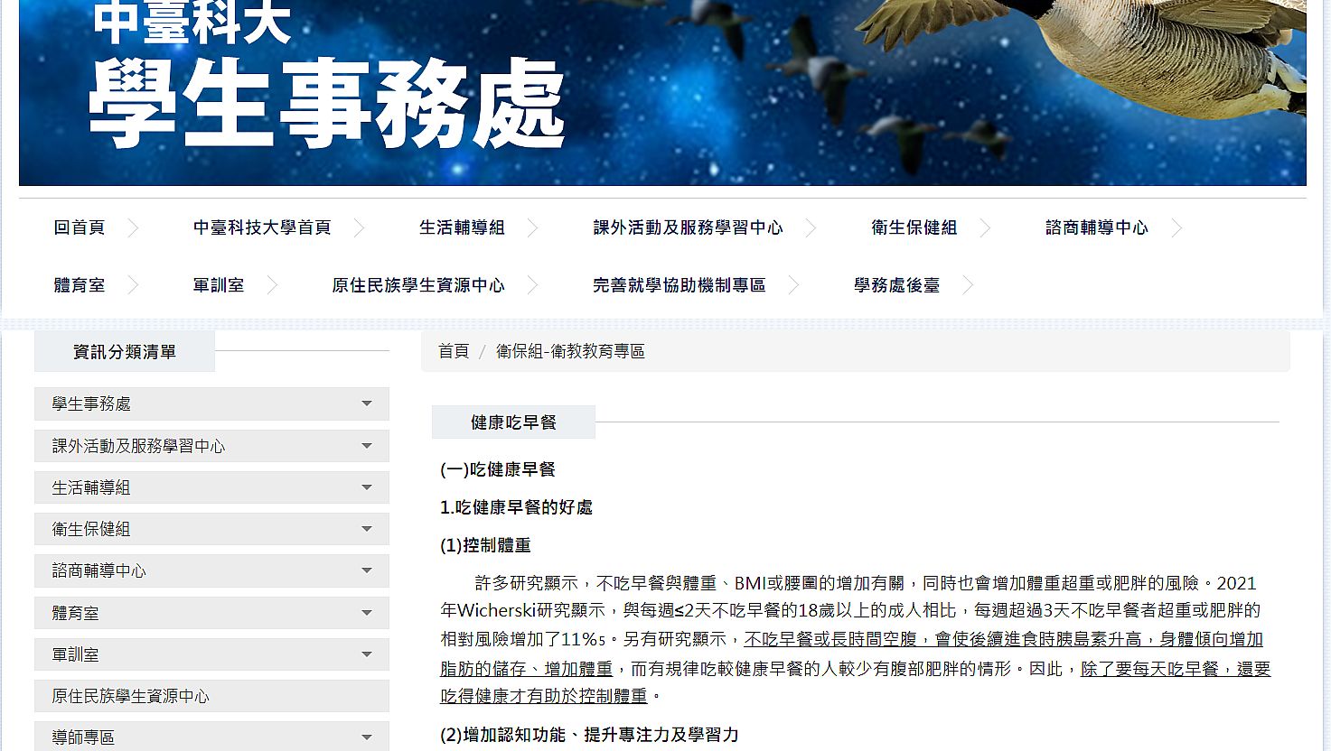| 4 | ![]() | 網站名稱 中臺科技大學 網址 https://stuaff.ctust.edu.tw/p/406-1022-58999,r330.php?Lang=zh-tw 網站簡介 這是一個中臺科技大學寫的關於吃早餐的文章,分別有4個重點 1.吃健康早餐的好處: (1)控制體重 (2)增加認知功能、提升專注力及學習力 (3)減少罹患心血管、慢性疾病的風險 2.吃早餐的時間 「睡醒的2-3小時內,但不超過早上10點」或是「在早上5點到9點間進食」。 3.健康早餐的食物選擇原則 (1)至少含有3種以上的食物類別搭配,才能較均衡攝取營養 (2)避免選擇含有加工製品的食物 (3)避免選擇油炸食品 (4)注意抹醬、調味料的油糖鹽含量 (5)飲品以原味、無添加糖為主 4.早餐搭配舉例 超商:鹽蔥豬肉御飯糰 西式早餐店:里肌肉蛋漢堡 中式早餐店:蔬菜蛋餅 我們之後早餐投票活動也可以參考這篇文章設計投票的選項! | 吳承陽 | 2025/9/19 上午 10:44:50 |