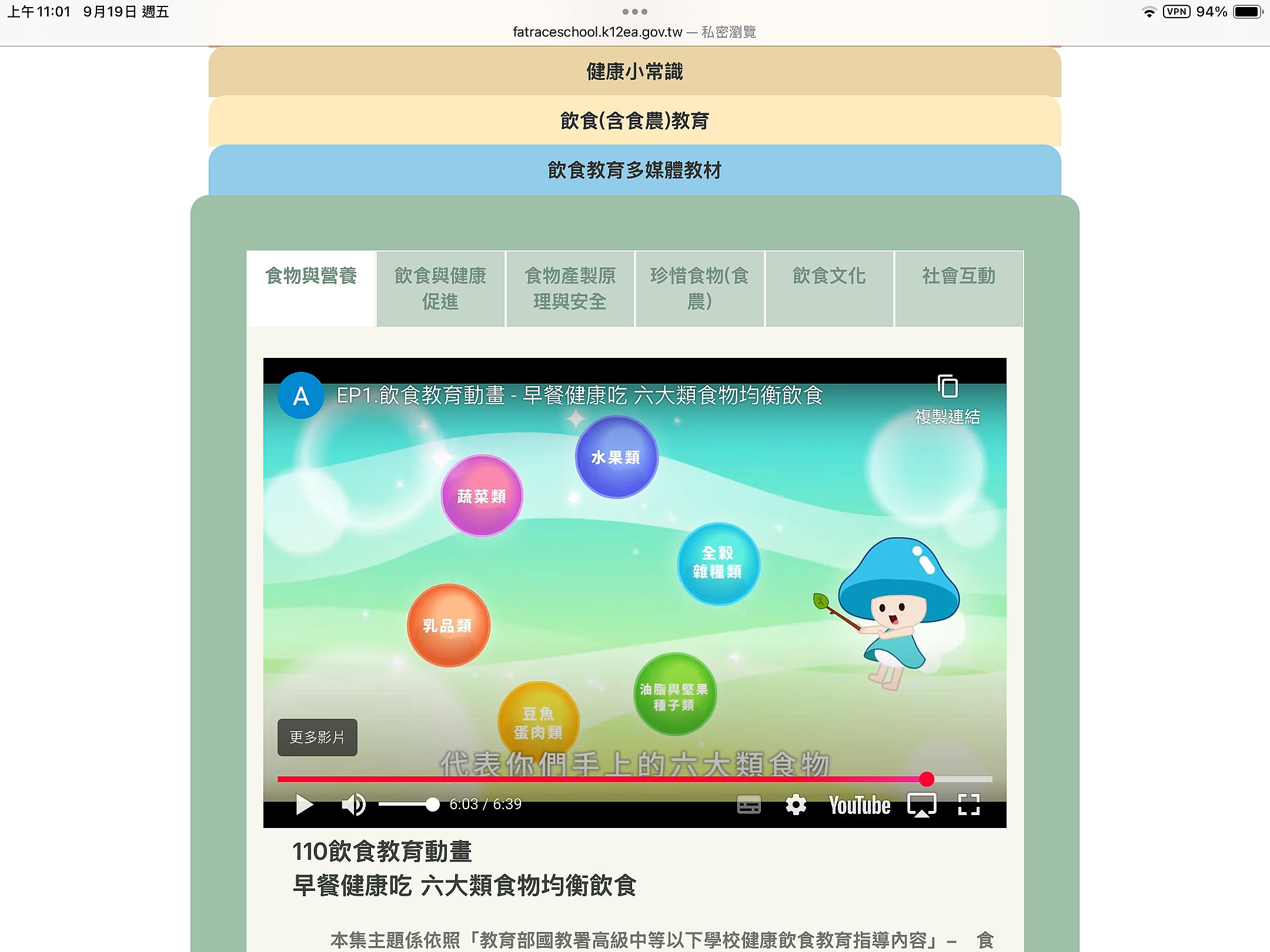 | 5 | ![]() | 網站名稱 校園食材登錄平台 網址 https://fatraceschool.k12ea.gov.tw/frontend/nutritionEducation.html 網站簡介 這個網站介紹了六大類,雜糧類、蔬菜類、豆魚蛋肉類、堅果類、乳品類、水果類,得了六個能做六個能量球,最後三為小朋友成為健康小尖兵。 | 江耀文 | 2025/9/19 上午 11:08:24 |