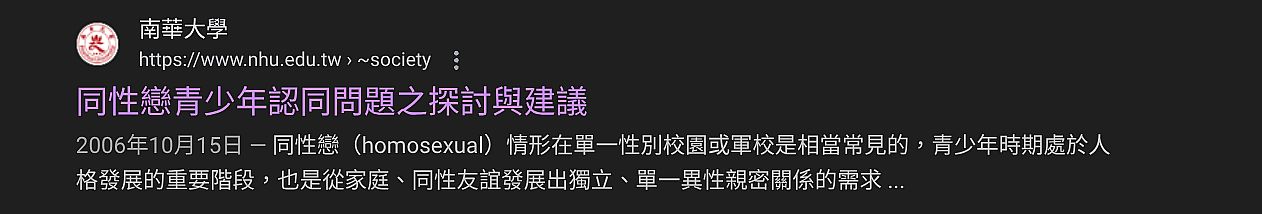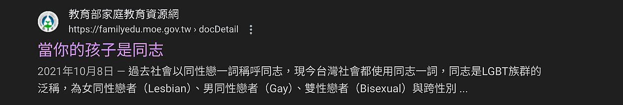 | 2 | ![]() | 作者 吳旻蓁 來源 https://familyedu.moe.gov.tw/docDetail.aspx?uid=8856&pid=1033&docid=223272 描述 2021年10月8日 — 過去社會以同性戀一詞稱呼同志,現今台灣社會都使用同志一詞,同志是LGBT族群的泛稱,為女同性戀者(Lesbian)、男同性戀者(Gay)、雙性戀者(Bisexual)與跨性別 ... | 吳旻蓁 | 2025/9/15 下午 03:56:22 |