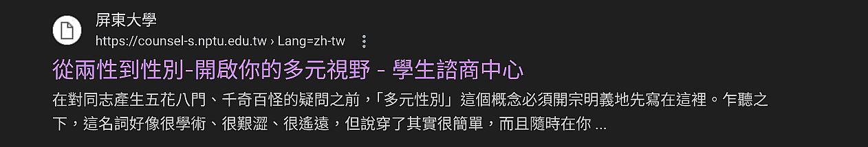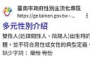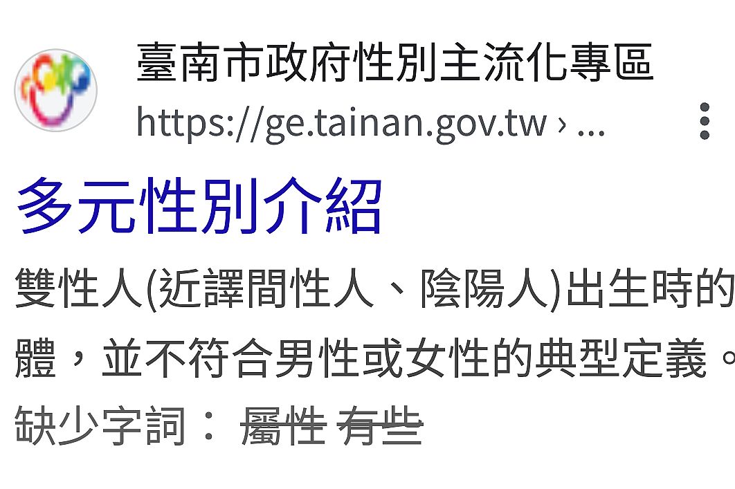 | 2 | ![]() | 網站名稱 台南市政府性別主流化專區 網址 https://ge.tainan.gov.tw/cp.aspx?n=43887 網站簡介 雙性人(近譯間性人、陰陽人)出生時的生理或生物性別特徵,比如解剖學性徵、生殖器官、賀爾蒙或染色體,並不符合男性或女性的典型定義。雙性人可能有任何性傾向和性別認同。 | 唐采儀 | 2025/9/15 下午 03:46:30 |