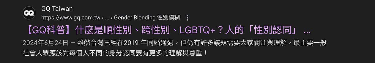 | 4 | ![]() | 作者 吳旻蓁 來源 https://www.gq.com.tw/bettermen/article/%E6%80%A7%E5%88%A5%E8%AA%8D%E5%90%8C-%E6%80%A7%E5%88%A5%E5%B 描述 2024年6月24日 — 雖然台灣已經在2019 年同婚通過,但仍有許多議題需要大家關注與理解,最主要一般社會大眾應該對每個人不同的身分認同要有更多的理解與尊重! | 吳旻蓁 | 2025/9/15 下午 03:59:12 |