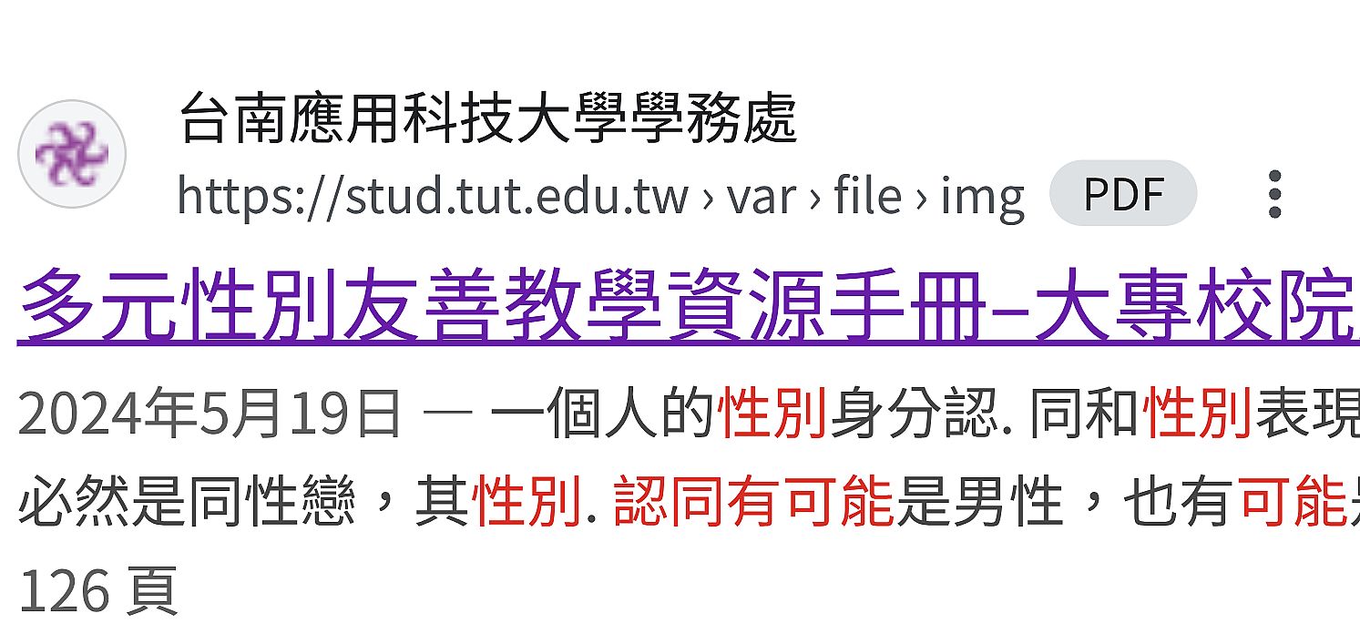 | 1 | ![]() | 網站名稱 台南應用科技大學學務處 網址 https://stud.tut.edu.tw/var/file/7/1007/img/1434/565873655.pdf 網站簡介 一個人的性別身分認. 同和性別表現,其實有許多排列的組合,一位外表陰柔的男生不必然是同性戀,其性別. 認同有可能是男性,也有可能是女性,而一位女同性戀的 ... | 唐采儀 | 2025/9/15 下午 03:43:56 |