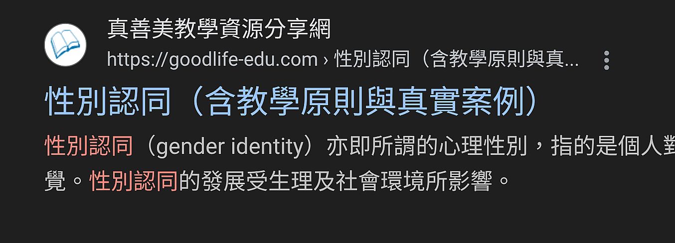 | 3 | ![]() | 網站名稱 真善美資源分享網 網址 https://goodlife-edu.com/%E6%80%A7%E5%88%A5%E8%AA%8D%E5%90%8C%EF%BC%88%E5%90%AB%E6%95%99%E5%AD%B8%E5%8E%9F%E5%89%87%E8%88%87%E7%9C%9F%E5%AF%A6%E6%A1%88%E4%BE%8B%EF%BC%89/ 網站簡介 性別認同(gender identity)亦即所謂的心理性別,指的是個人對於自我偏向男性化或女性化特質的相對知覺。性別認同的發展受生理及社會環境所影響。 | 吳旻蓁 | 2025/9/15 下午 03:51:34 |