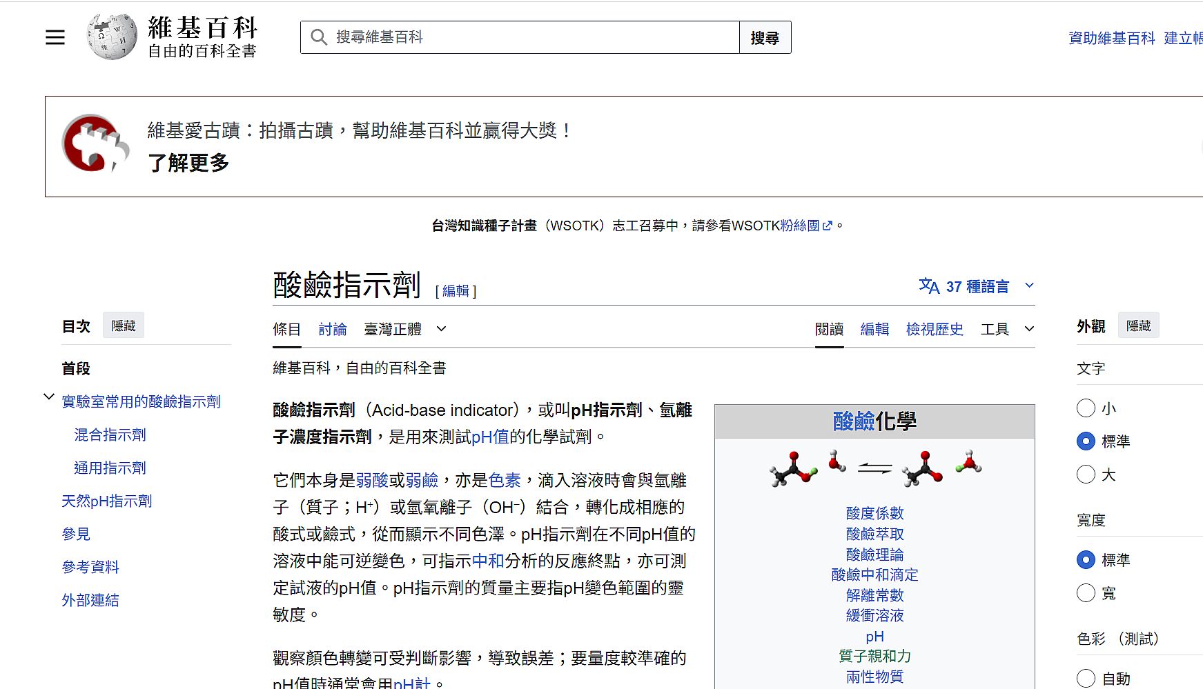 | 1 | ![]() | 網站名稱 酸鹼指示劑- 維基百科,自由的百科全書 網址 https://zh.wikipedia.org/zh-tw/%E9%85%B8%E7%A2%B1%E6%8C%87%E7%A4%BA%E5%89%82 網站簡介 酸鹼指示劑是一類能隨溶液酸鹼度(pH 值)變化而改變顏色的化學物質,通常為弱酸或弱鹼,具有染料特性。它們廣泛應用於化學實驗,例如酸鹼滴定時用來判斷反應終點。常見的指示劑有石蕊、酚酞、甲基紅等,各自具有不同的變色範圍。除此之外,也有「通用指示劑」,能在 pH 0 至 14 的廣範圍內呈現多段顏色變化。酸鹼指示劑雖然無法提供極精確的數值,但作為快速判斷酸鹼性的工具,既直觀又實用,在科學教育與日常應用(如檢測清潔劑、環境酸鹼度)上具有重要價值。 | 黃品樺 | 2025/9/7 下午 09:20:01 |