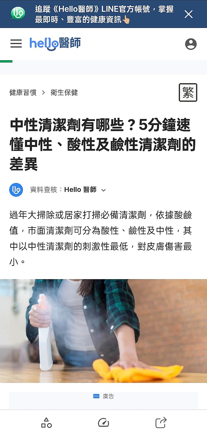 | 3 | ![]() | 網站名稱 中性清潔劑有哪些?5分鐘速懂中性、酸性及鹼性清潔劑的差異 網址 https://share.google/2sJDey5ZYFUmeiZ5B 網站簡介 過年大掃除或居家打掃必備清潔劑,依據酸鹼值,市面清潔劑可分為酸性、鹼性及中性,其中以中性清潔劑的刺激性最低,對皮膚傷害最小。 中性清潔劑有哪些?5分鐘速懂中性、酸性及鹼性清潔劑的差異 中性清潔劑是什麼?如何區分鹼性、酸性及中性清潔劑?市面上有哪些中性清潔劑?《Hello醫師》一次為您詳解! | 張文馨 | 2025/9/13 下午 01:33:48 |