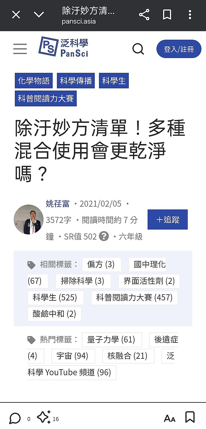 | 4 | ![]() | 網站名稱 除汙妙方清單!多種混合使用會更乾淨嗎? - PanSci 泛科學 網址 https://share.google/eZEu14PbnUyLjXpUD 網站簡介 廚房的油汙是大掃除的大魔王!網路上流傳的各種去除油污妙方,你知道哪些是有用的嗎? 《用科學拯救怦然崩潰的髒亂,這樣的掃除你洗翻嗎?》專題為你簡介去除油污的基礎原理,從科學的角度分析網路上的妙方是否屬實?讓你用對方法面對令人崩潰的油汙! | 張文馨 | 2025/9/13 下午 09:52:33 |