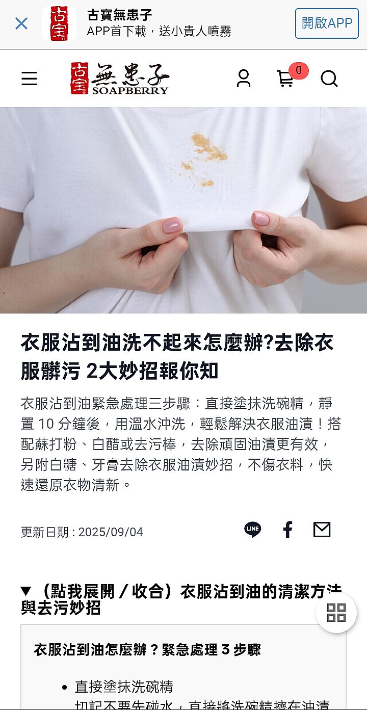 | 5 | ![]() | 網站名稱 衣服沾到油洗不起來怎麼辦?去除衣服髒污 2大妙招報你知 | 古寶無患子 網址 https://share.google/m6FIeqoCDhV4lYO1O 網站簡介 衣服沾到油緊急處理三步驟:直接塗抹洗碗精,靜置 10 分鐘後,用溫水沖洗,輕鬆解決衣服油漬!搭配蘇打粉、白醋或去污棒,去除頑固油漬更有效,另附白糖、牙膏去除衣服油漬妙招,不傷衣料,快速還原衣物清新。 | 張文馨 | 2025/9/13 下午 09:57:36 |