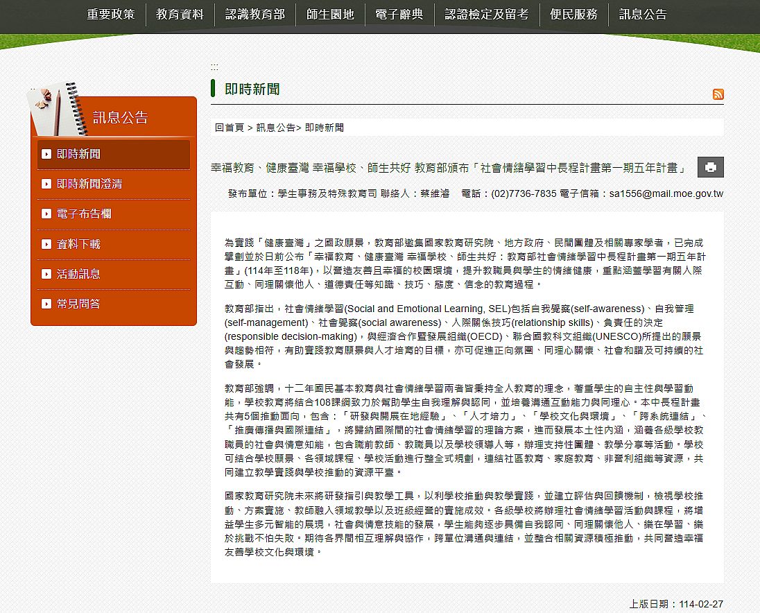 | 2 | ![]() | 網站名稱 教育部全球資訊網 網址 https://www.edu.tw/News_Content.aspx?n=9E7AC85F1954DDA8&s=CA99860C9634CFB0 網站簡介 社會情緒學習(Social and Emotional Learning, SEL)包括自我覺察(self-awareness)、自我管理(self-management)、社會覺察(social awareness)、人際關係技巧(relationship skills)、負責任的決定(responsible decision-making) | 黃妍熹 | 2025/8/1 下午 10:35:36 |