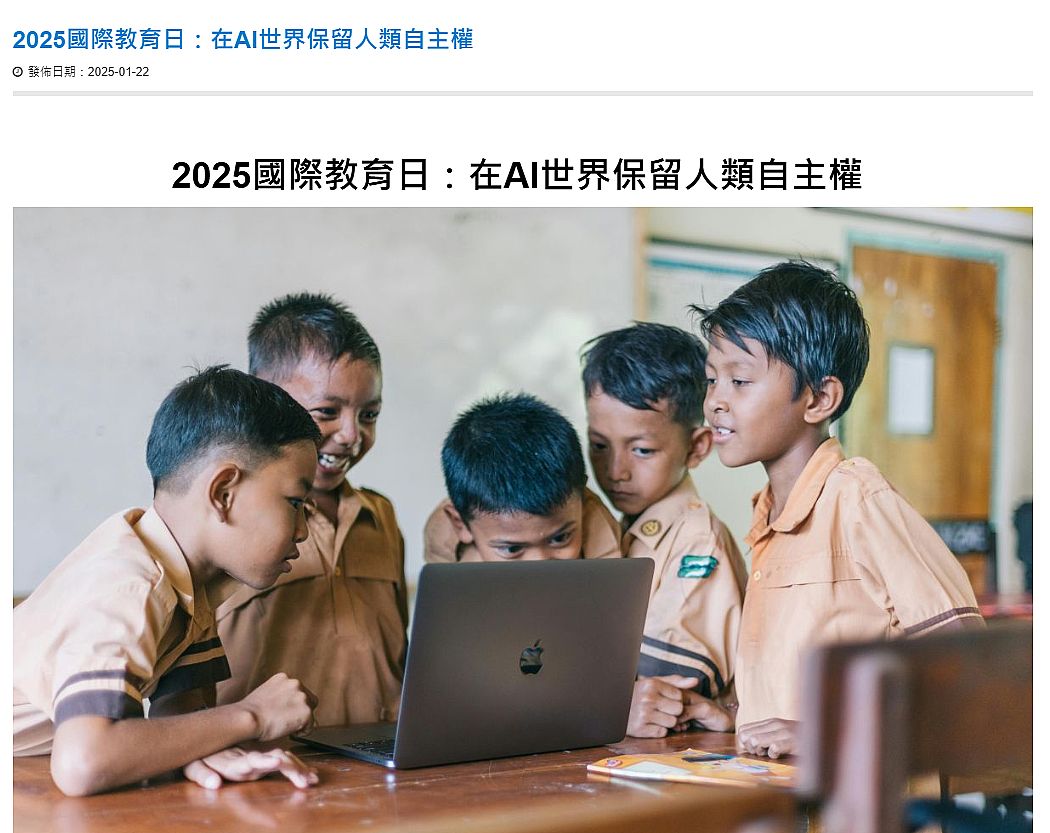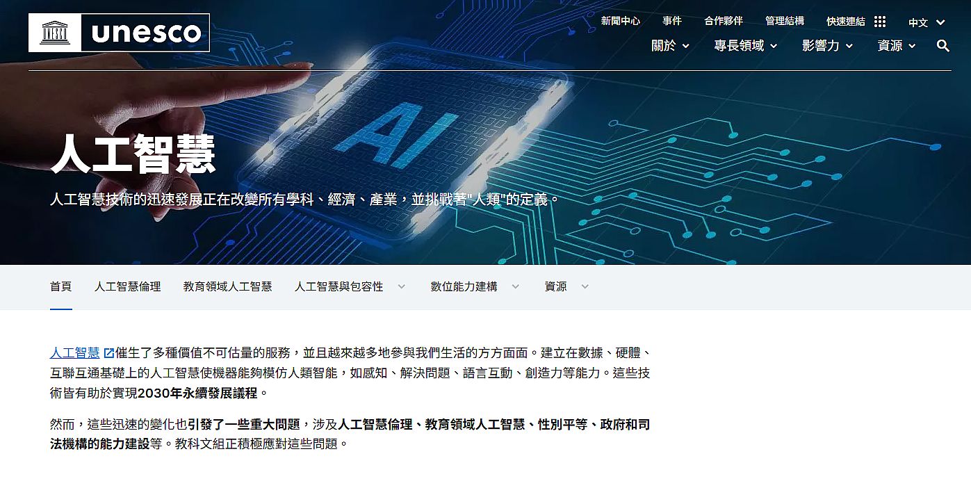 | 4 | ![]() | 網站名稱 聯合國教科文組織 網址 https://www.unesco.org/zh/artificial-intelligence 網站簡介 人工智慧催生了多種價值不可估量的服務,並且越來越多地參與我們生活的方方面面。建立在數據、硬體、互聯互通基礎上的人工智慧使機器能夠模仿人類智能,如感知、解決問題、語言互動、創造力等能力。這些技術皆有助於實現2030年永續發展議程。 然而,這些迅速的變化也引發了一些重大問題,涉及人工智慧倫理、教育領域人工智慧、性別平等、政府和司法機構的能力建設等。教科文組正積極應對這些問題。 | 黃妍熹 | 2025/8/1 下午 11:11:34 |