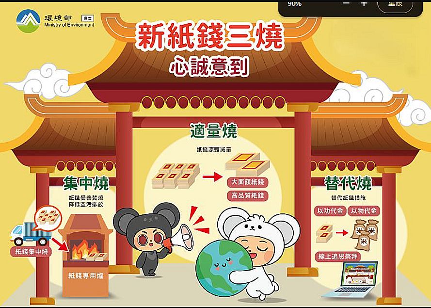 | 4 | ![]() | 網站名稱 空氣品質改善維護資訊網 網址 https://air.moenv.gov.tw/envtopics/AirQuality_17.aspx 網站簡介 祭祀是重要的傳統文化之一,但祭祀的燃燒行會衍生空氣污染等問題,對於環境品質及健康都會產生危害。現今友善祭祀觀念日漸受民眾接受,在尊重信仰觀念及兼顧環保下,環境部期望透過「新紙錢三燒」政策,從各面向推動污染減量,改善環境品質。 新紙錢三燒分別說明如下: 「集中燒」:透過設有空污防制設備的金爐或紙錢專用爐焚燒,以降低空氣污染物排放。 「適量燒」:使用大面額紙錢或適度減少份量,並使用具CNS標章的高品質紙錢,達到減少空氣污染物排放。 「替代燒」:響應「以功代金」或「以米(物)代金」,從源頭改變祭祀習慣。 本篇文章大致在說,燒紙錢是國人的習慣,但燒紙錢對環境會造成很大的汙染,了解環保新政策,是我們研究的序幕,讓我們很快就能進入狀況。 | 余秉叡 | 2025/10/1 上午 06:11:56 |