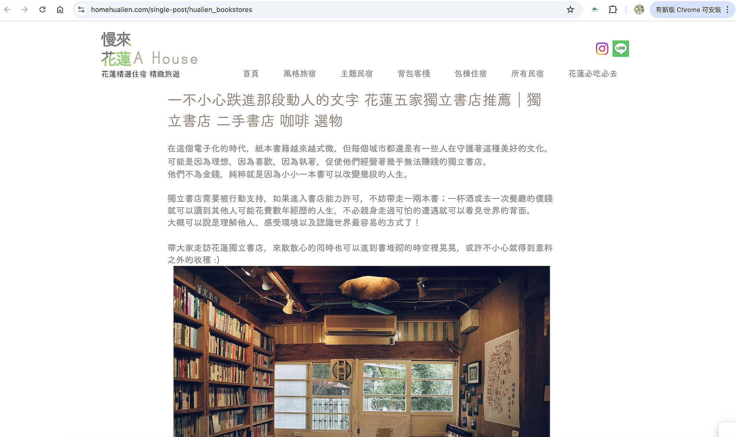 | 3 | ![]() | 網站名稱 花蓮五家獨立書店推薦 網址 https://www.homehualien.com/single-post/hualien_bookstores 網站簡介 這個網站詳細的介紹了五家書店不同的特色和氛圍,其中還有介紹到我們小論文中的時光二手書店,他講到進入時光書店,真的感受到時光倒轉的感覺,網站中的照片也都相當厲害 | 黃安妤 | 2025/8/29 上午 09:32:52 |