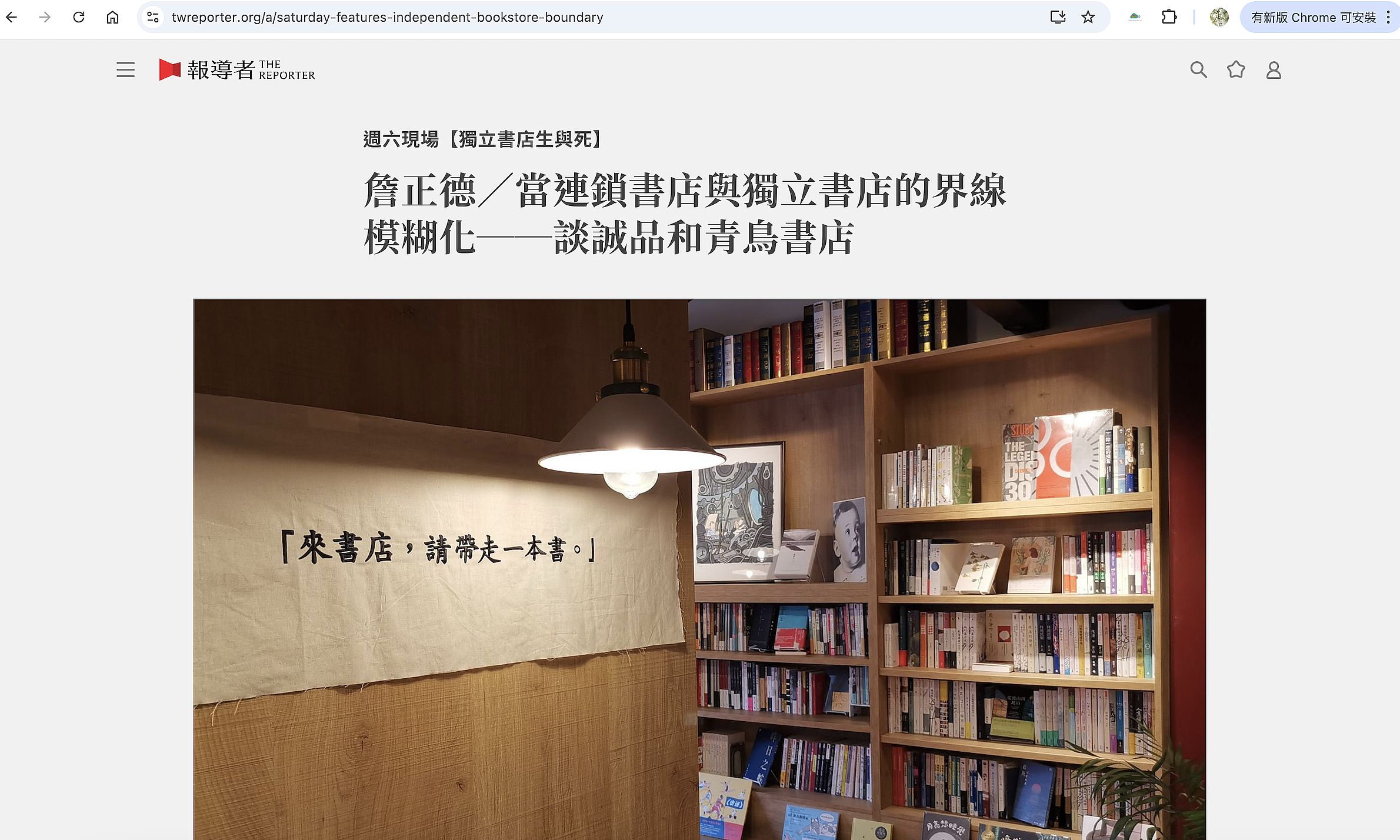 | 4 | ![]() | 網站名稱 當連鎖書店與獨立書店的界線模糊化──談誠品和青鳥書店 網址 https://www.twreporter.org/a/saturday-features-independent-bookstore-boundary 網站簡介 在新的時代裡,經營實體書店與是否連鎖、獨不獨立已經無關緊要,反而若能透過異業結盟,因地制宜,或有更多令人意想不到的書店形式產生。 | 黃安妤 | 2025/8/29 上午 09:44:30 |