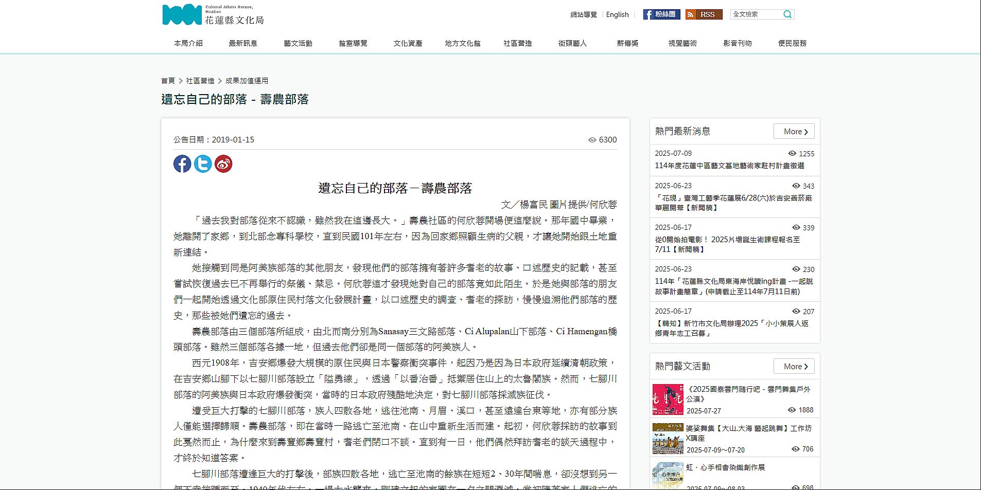 | 1 | ![]() | 網站名稱 遺忘自己的部落-壽農部落 網址 https://www.hccc.gov.tw/zh-tw/Community/NewsDetail/8849 網站簡介 壽農部落由三個部落所組成,分別為Sanasay三文路部落、Ci Alupalan山下部落、Ci Hamengan橋頭部落。雖然三個部落各據一地,但過去他們卻是同一個部落的阿美族人。1908年爆發七腳川事件,導致七腳川部落的族人四散各地,逃往池南、月眉、溪口,甚至遠達台東等地。壽農部落,即在當時一路逃亡至池南、在山中重新生活而建。這些故事,至今仍還有許多縫隙:「在跟時間賽跑……。」如同許多口述歷史的調查者,從何欣蓉嘴裡,吐出了同樣的感嘆。她說,自我認同是一件重要的事情,不先認識我們是誰,我們沒有辦法對自己的身分感到驕傲,甚至只能在主流的價值觀中淪為被歧視的對象。 讓部落的孩子們知道他們是誰,這成為壽農部落一群青年最大的願望。整個環境對於他們族群仍是種傷害,記起自己的名字、記起自己是誰,是她唯一能夠給孩子們的禮物。 | 張芳語 | 2025/7/15 下午 01:34:31 |