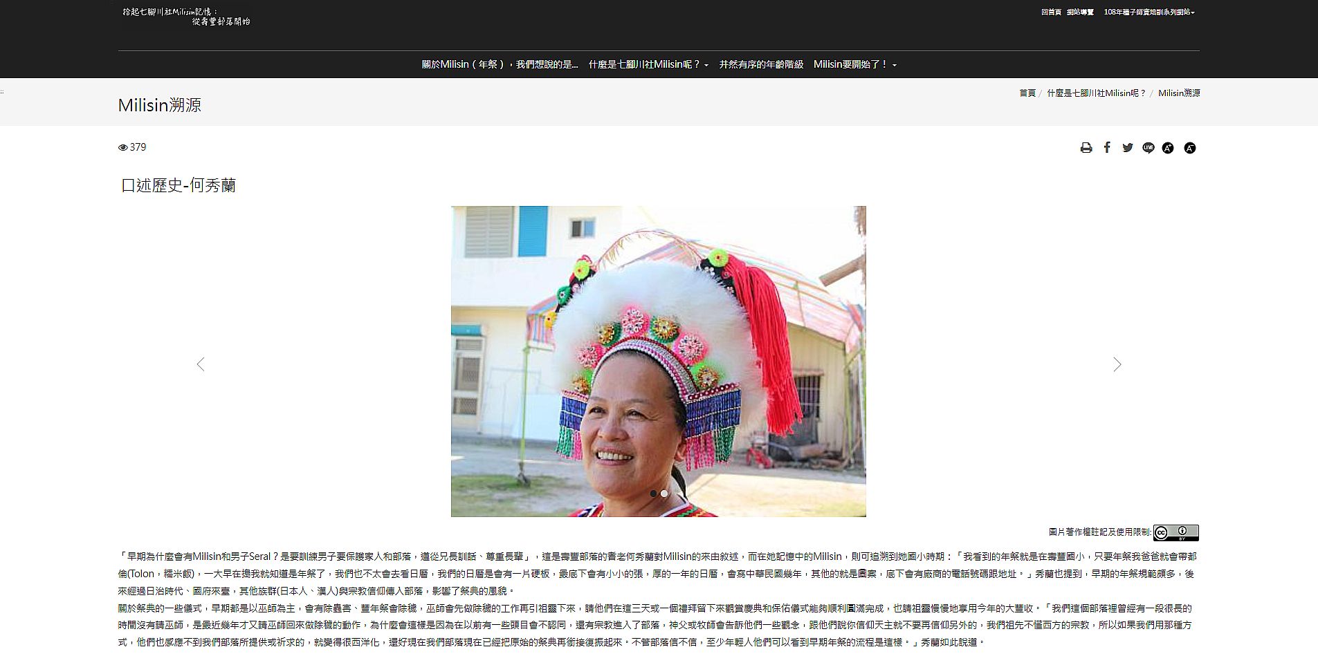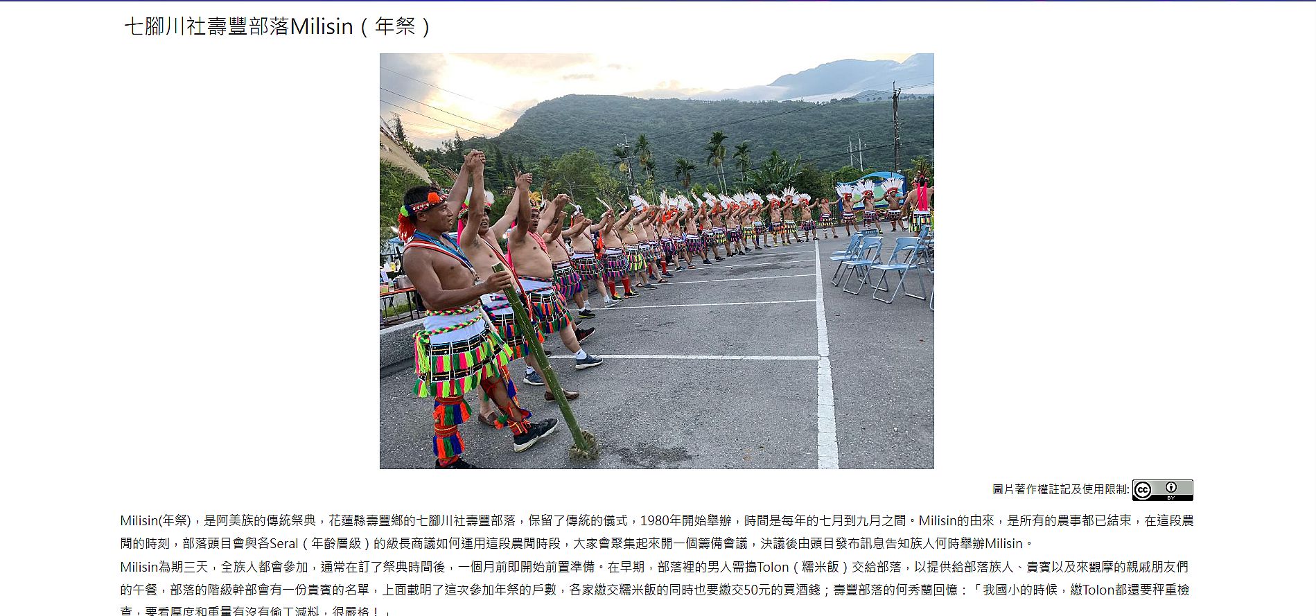 | 3 | ![]() | 網站名稱 拾起七腳川社Milisin記憶:從壽豐部落開始 網址 https://demo.cms.culture.tw/Milisin/zh-tw/original/315251 網站簡介 「早期為什麼會有Milisin和男子Seral?是要訓練男子要保護家人和部落,遵從兄長訓話、尊重長輩」,這是壽豐部落的耆老何秀蘭對Milisin的來由敘述。關於祭典的一些儀式,早期都是以巫師為主,會有除蟲害、豐年祭會除穢,巫師會先做除穢的工作再引祖靈下來,請他們在這三天或一個禮拜留下來觀賞慶典和保佑儀式能夠順利圓滿完成,也請祖靈慢慢地享用今年的大豐收。 | 張芳語 | 2025/7/15 下午 02:22:16 |