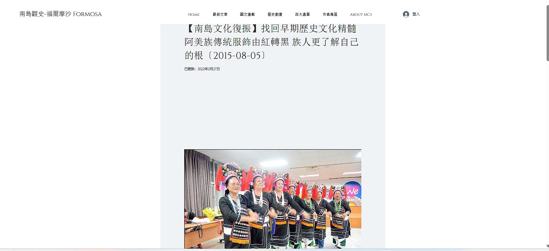 | 5 | ![]() | 網站名稱 南島觀史-福爾摩沙FORMOSA 網址 https://siow3033.wixsite.com/austronesiaformosa/post/%E6%89%BE%E5%9B%9E%E5%8E%9F%E5%82%B3%E7%B5%B1-%E9%98%BF%E7%BE%8E%E6%97%8F%E6%9C%8D%E9%A3%BE%E7%94%B1%E7%B4%85%E8%BD%89%E9%BB%91 網站簡介 最早期阿美族傳統服飾主色是黑色,但後來隨著觀光歌舞、商演需求,為求喜慶、熱鬧,配合外在環境而改成紅色,花蓮市公所開辦阿美傳統服飾、帽飾研習,從歷史資料中與耆老訪談中逐步還原早期阿美族傳統服飾原來樣貌,舉行成果分享會,黑色服飾、鮮花帽飾顛覆大眾對阿美族服飾色系的認知。 | 張晏綾 | 2025/8/27 下午 04:14:49 |