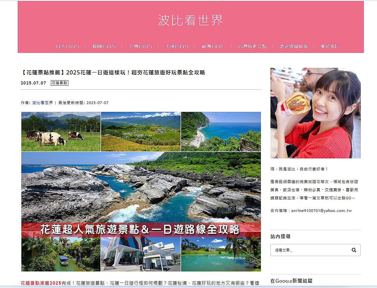 | 4 | ![]() | 網站名稱 波比看台灣 網址 https://bobbyfun.tw/2024-02-24-3023/ 網站簡介 介紹花蓮旅遊景點、花蓮一日遊行程如何規劃 | 蕭巧惇 | 2025/7/23 下午 03:21:02 |