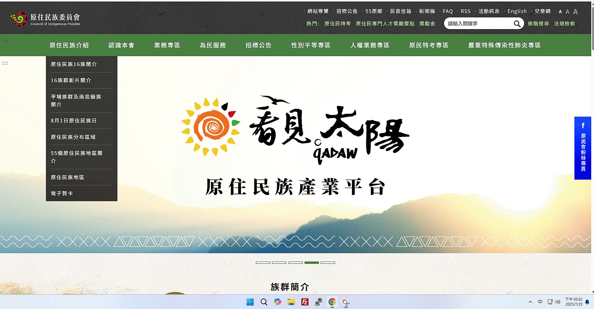 | 2 | ![]() | 網站名稱 原住民委員會 網址 https://www.cip.gov.tw/zh-tw/index.html 網站簡介 原民會的官方資訊平台,提供關於原住民族的政策、活動、文化、教育、法律等各方面資訊。 | 彭筠善 | 2025/7/23 下午 03:35:17 |