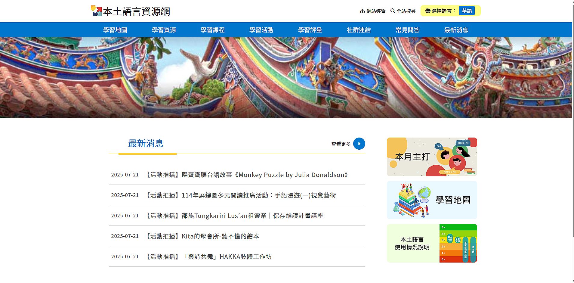 | 3 | ![]() | 網站名稱 本土語言資訊網 網址 https://mhi.moe.edu.tw/ 網站簡介 「本土語言資訊網」是由教育部設立的一個網站,主要目的是推廣、保存與教學台灣的本土語言,包括: 1.臺語(臺灣閩南語) 2.客語(包含六大腔調) 3.原住民族語(十六族) 4.新住民語言(如印尼語、越南語等,部分資源有納入) | 林郁庭 | 2025/7/23 下午 03:36:45 |