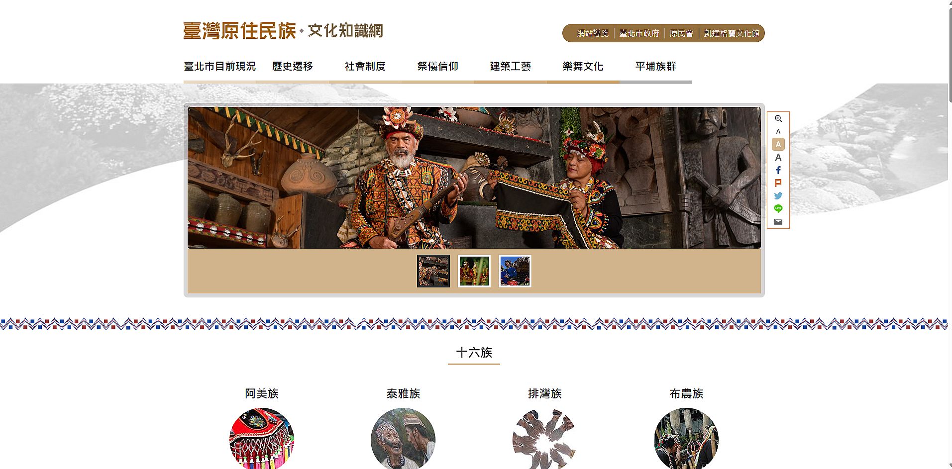 | 5 | ![]() | 網站名稱 台灣原住民族文化知識網 網址 https://knowlegde.gov.taipei/Default.aspx 網站簡介 旨在保存、推廣並提供關於臺灣原住民族文化知識的資訊。 | 彭筠善 | 2025/7/23 下午 03:43:37 |