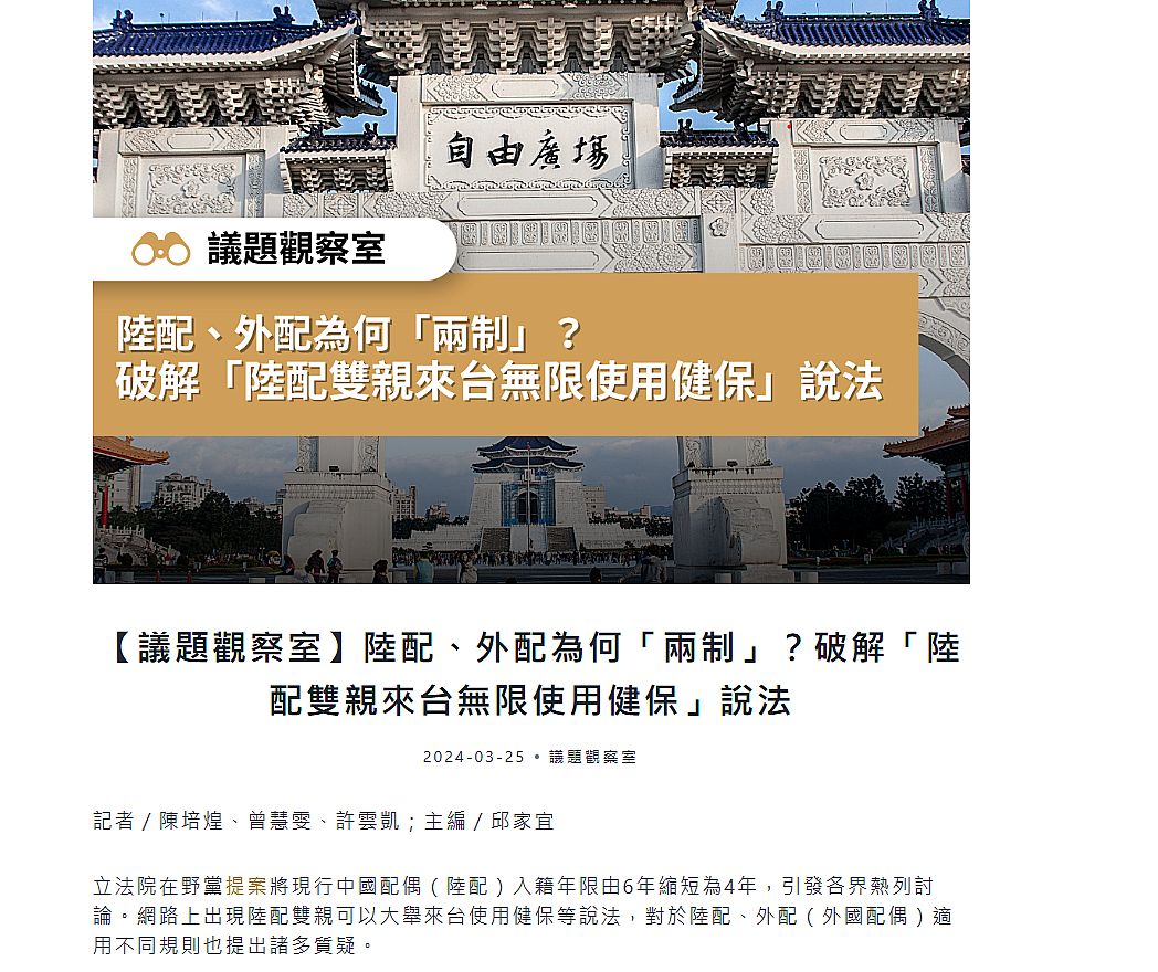 | 1 | ![]() | 網站名稱 【議題觀察室】陸配、外配為何「兩制」?破解「陸配雙親來台無限使用健保」說法 網址 https://tfc-taiwan.org.tw/migration_article_105444_10415/ 網站簡介 討論陸配為何與外配的入台規則不一樣,再從陸配討論到外配父母入台使用健保是否會討論陸配為何與外配的入台規則不一樣,再從陸配討論到外配父母入台使用健保是否會有不公平 | 李凱堯 | 2025/7/23 下午 02:33:13 |