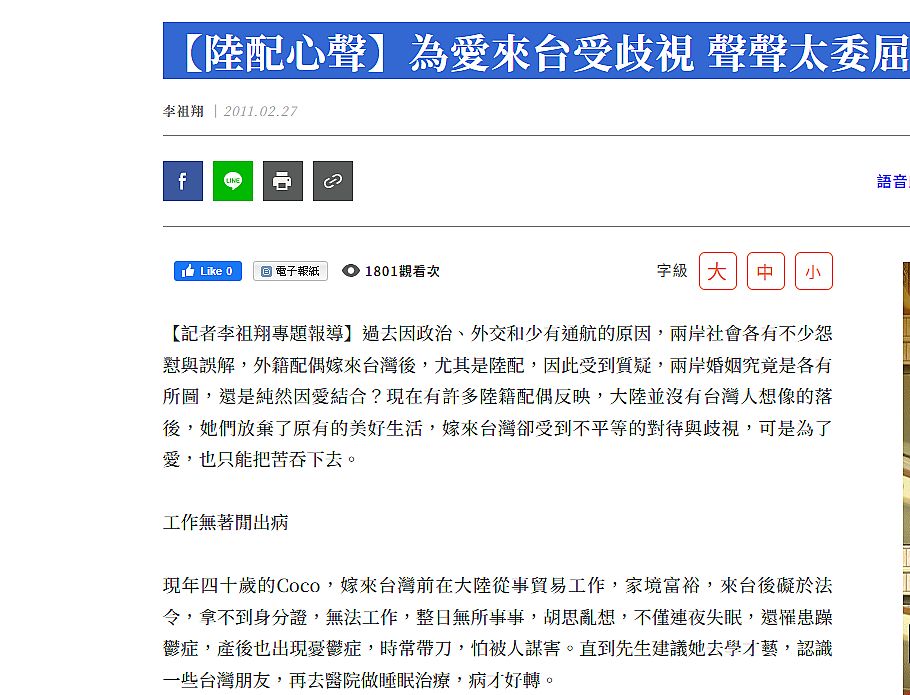 | 3 | ![]() | 網站名稱 【陸配心聲】為愛來台受歧視 聲聲太委屈 網址 https://www.merit-times.com.tw/NewsPage.aspx?unid=218875 網站簡介 外配來台找工作不易,且受台人歧視 | 李凱堯 | 2025/7/23 下午 03:20:53 |