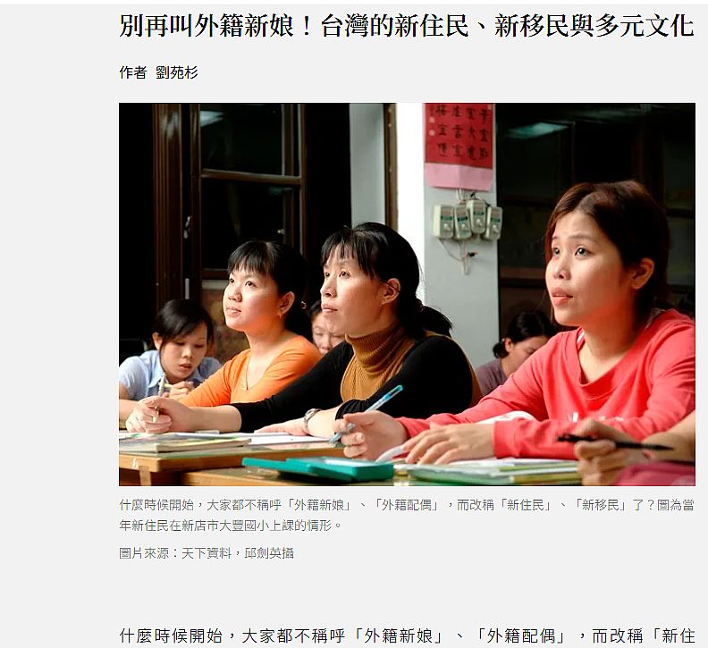 | 4 | ![]() | 網站名稱 別再叫外籍新娘!台灣的新住民、新移民與多元文化 網址 https://opinion.cw.com.tw/blog/profile/31/article/11972 網站簡介 探討新住民在台灣所遇到困難與不公平對待,如要一個人去做11人家庭的家務,語言不通,找工作時因新住民身分所遭到的歧視 | 李凱堯 | 2025/7/23 下午 03:42:12 |