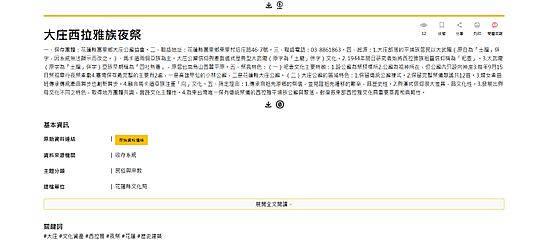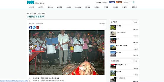 | 1 | ![]() | 網站名稱 花蓮縣文化局--大庄西拉雅族夜祭 網址 https://www.hccc.gov.tw/zh-tw/CulturalHeritage/Detail/147 網站簡介 1.富里鄉東里村(大庄)內現仍保存一座西拉雅族人供奉祖神「阿立太祖」的公廨,是東部地區碩果僅存的西拉雅族公廨,自清代至光復初,族人謹依古禮舉行祭祖牽戲活動,光復後雖仍依例於每年農曆9月15日舉行祭祖儀式,但傳統的大武壠(大滿)人牽戲活動,卻因社會型態改變而日漸式微。 2.每年農曆9月15日都會舉行「牽戲夜祭」的祭祖活動,現在已由地方發展成「大庄平埔文化節」,成為富里鄉最具族群特色的地方文化慶典之一;除此之外,縣內之玉里鎮、富里鄉各村里還有些零星的平埔族人家供奉「太祖」、「開基祖」、「太上老君」、「老祖」等等,為花蓮縣內的西拉雅平埔族人遺留下一些傳統信仰的風采。 3.祭典特色 大武壠(Taivoan)亞族的祀壺文化最主要特徵是: (1)設公廨為祭拜場所。 (2)公廨為祖神(阿立祖、太祖)之所在,但公廨內不拜祀壺,只設向神座。 (3)每年9月15日祭祖,舉行夜祭跳戲(牽戲、牽曲)。 (4)臺灣的大武壠(Taivoan)亞族公廨文化保存最完整的主要有2處,一是高雄甲仙的小林公廨,二是花蓮縣大庄公廨。 花蓮縣大庄公廨的區域特色有: (1)目前仍保留傳統的公廨樣式。 (2)保留了一套完整的祭儀歌謠,共計有12首。 (3)婦女牽曲班的傳承,除仍保留傳統之牽曲舞步,也有創新之舞步。 (4)融合有馬卡道(Makatao)亞族注重「向」文化的特徵。 | 陳文立 | 2025/7/24 上午 09:31:25 |