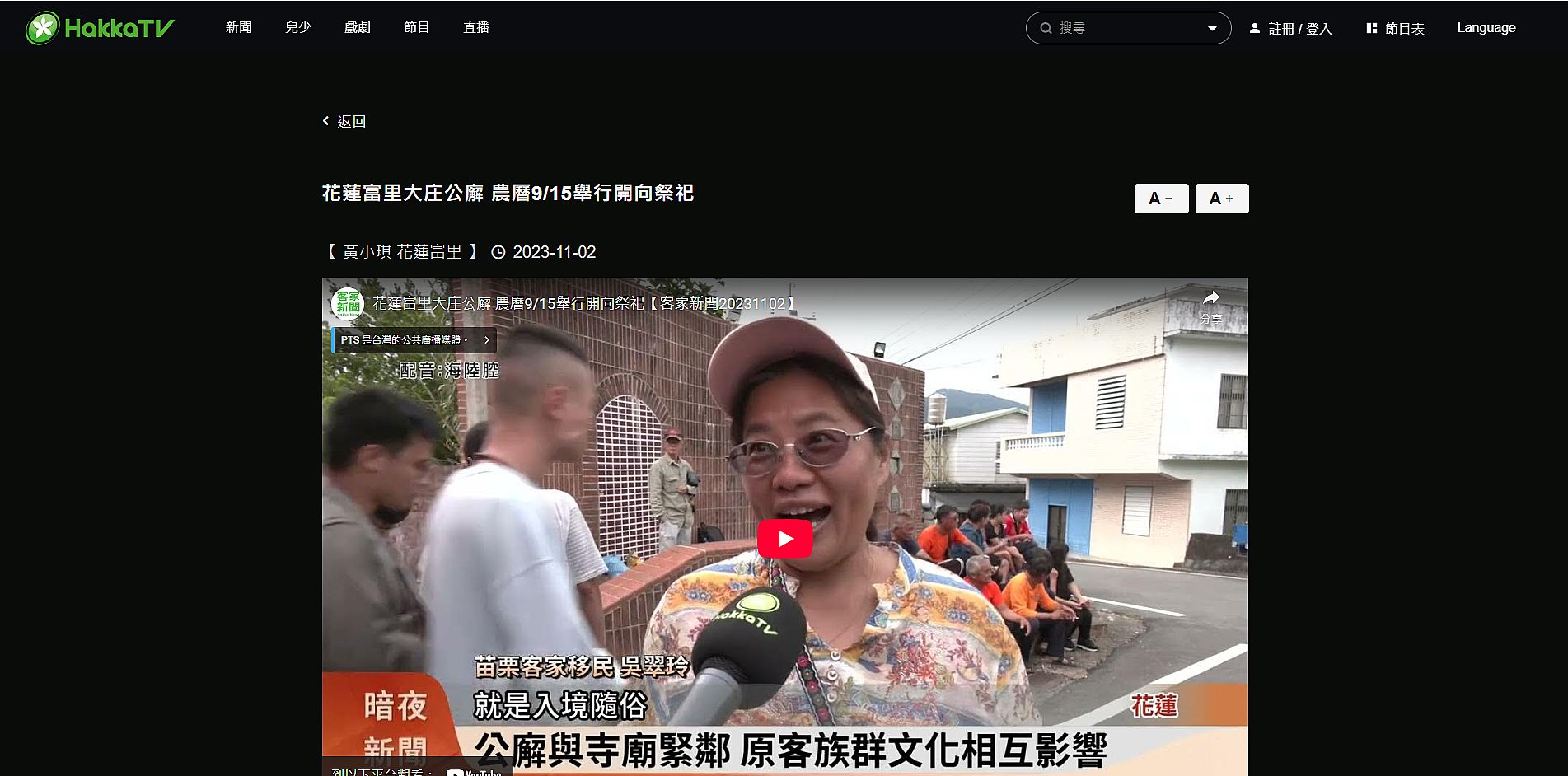 | 5 | ![]() | 網站名稱 客家新聞 網址 https://www.hakkatv.org.tw/news-detail/1698921123974568 網站簡介 花蓮富里的大庄公廨,保留了相當完整的大武壠族公廨文化,每年農曆9月15日,大武壠族人都會舉辦開向祭祀,也就是以「牽曲、夜祭」為主的傳統儀式,由於有不少客家人混居,現在這項傳統文化,也包含許多客家元素,成為東部唯一維持活動力,且兼具大武壠、客家文化的特色慶典。 來到大庄生活的大武壠族人,習慣上將一整年分成春夏的「禁向」和秋冬的「開向」,「開向」類似於漢人的過年,或西方伊斯蘭教的開齋,都有感恩、收穫的意思,而村落中客家人祭祀的玉蓮寺,和大武壠人祭祀的公廨緊鄰,多元族群文化也相互影響。 花蓮縣富里鄉大庄公廨協會理事長潘資洲:「然後一直到(農曆)9月15收成了,就大家可以過比較輕鬆的生活,就是開完向之後,大概就可以去捕魚、打獵,蓋房子、結婚什麼的。」 | 張允薰 | 2025/8/28 上午 10:36:41 |