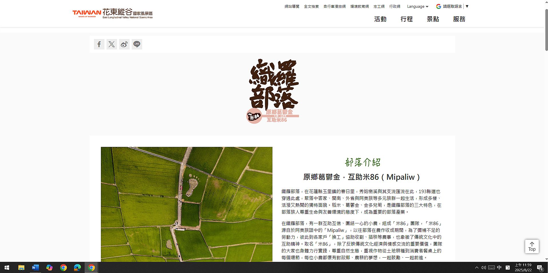 | 2 | ![]() | 網站名稱 Alida/米86 在織羅部落 網址 https://www.facebook.com/p/Alida%E7%B1%B386-%E5%9C%A8%E7%B9%94%E7%BE%85%E9%83%A8%E8%90%BD-100057493687157/?locale=zh_TW 網站簡介 您們好: 這個網站是大家好~我要介紹一個很特別的地方,叫做 織羅部落,在花蓮玉里喔! 這裡有一個臉書網站叫 Alida / 米86,名字聽起來有點神祕,其實很有意思呢! Alida 是阿美族話,意思是「葛鬱金」,是一種像薑一樣的植物。老人家會拿它來做點心或飲料,聽說對身體很好。 米86 則是「Mipaliw」,在阿美族的意思是「互相幫忙、一起工作」。以前大家種田的時候,會互相換工,所以米86代表著團結合作的精神。 在織羅部落,我們可以體驗好多有趣的活動: 到田裡插秧、收割,學習農夫的辛苦、 吃到葛鬱金做的點心,喝一口涼涼的葛鬱金茶、用彩色的米拼出圖案、 還能學做阿美族的「情人袋」,聽說是年輕人互相表白的禮物和看阿美族的歌舞表演,跟著大家一起唱唱跳跳。 我覺得這個地方很棒,因為不只是玩樂,還能學到阿美族的文化和智慧。 如果有機會,大家一定要來織羅部落一次,把這些有趣的故事分享給大家! | 徐雅祺 | 2025/8/22 下午 12:14:15 |