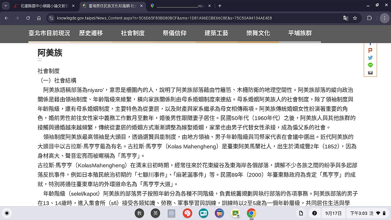 | 4 | ![]() | 網站名稱 臺灣原住民族文化知識網 網址 https://knowlegde.gov.taipei/ 網站簡介 這個網址的內容大概在說明:社會制度也就是社會結構、飲食文化、服飾文化、產業,在阿美族中部落稱為niyaro’意思是指柵圍內的人,說明了阿美族部落藉由竹籬笆與木柵防衛的地理空間性。阿美族部落是藉由領袖制度和年齡階級來維繫,除了領袖制度和年齡階級,以前還是會有母系婚姻制度的,財產和家中繼承為母女相傳兩項。阿美族傳統婚姻女性扮演著重要的角色,婚前男性前往女性家中義務工作數月至數年,婚後男性跟隨妻子居住。阿美族人與其他族群的人接觸久了和通婚會越頻繁,傳統從妻居的婚姻方式漸漸的改變為嫁娶婚姻,家業也由男子替代女性階層,漸漸的變為父系的社會。階層最大的是大頭目,是從選賢與能的制度,年齡階級selel或者kapot部落男人按照年齡或各種不同的階級,負責不同的各項事務,阿美族部落的男人在13歲或者14歲時,就會到sfi也就是稱為集會的意思,會接受著各項不同的知識或者勞務以及軍事學習等訓練。 | 朱柔棋 | 2025/9/17 下午 03:04:29 |